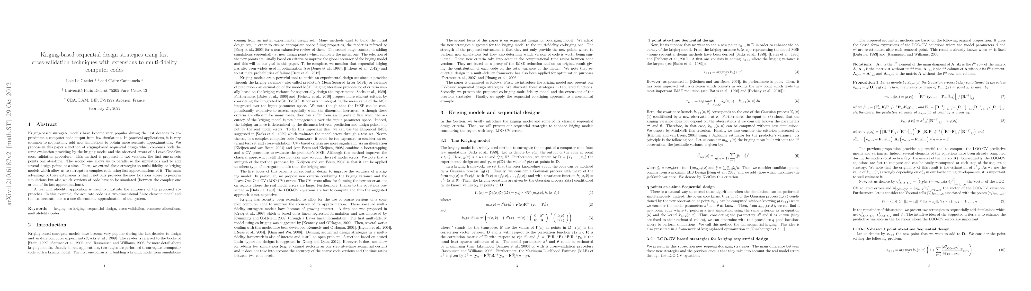 This paper proposes a new method for sequential design using kriging-based surrogate models, which combines error evaluation with cross-validation to efficiently select simulation points, and extends it to multi-fidelity computer codes.