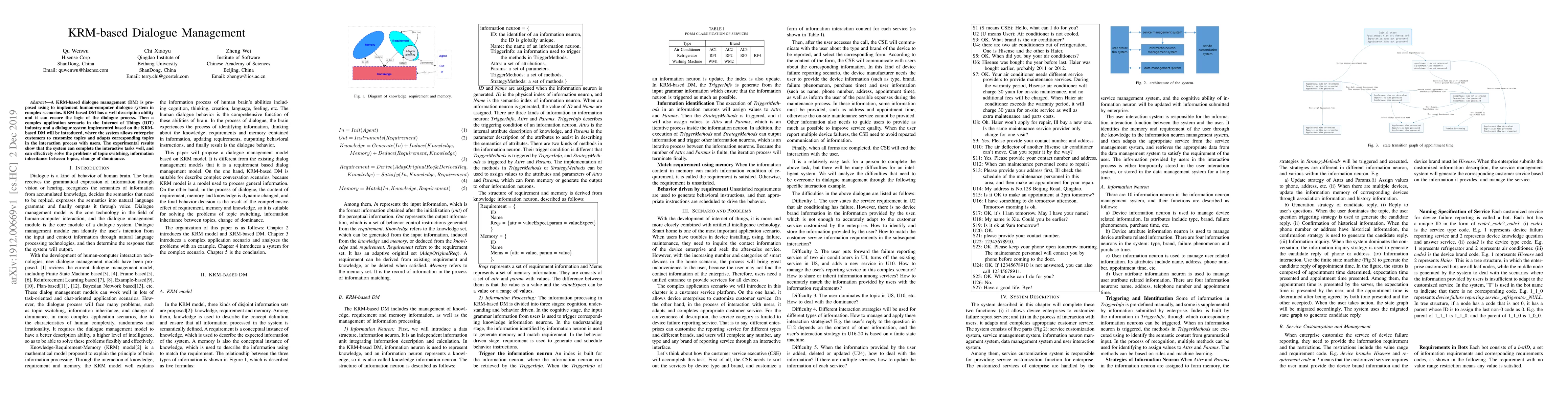 A KRM-based dialogue management (DM) is proposed using to implement human-computer dialogue system in complex scenarios. KRM-based DM has a well description ability and it can ensure the logic of the dialogue process. Then a complex application scenario in the Internet of Things (IOT) industry and a dialogue system implemented based on the KRM-based DM will be introduced, where the system allows enterprise customers to customize topics and adapts corresponding topics in the interaction process with users. The experimental results show that the system can complete the interactive tasks well, and can effectively solve the problems of topic switching, information inheritance between topics, change of dominance.