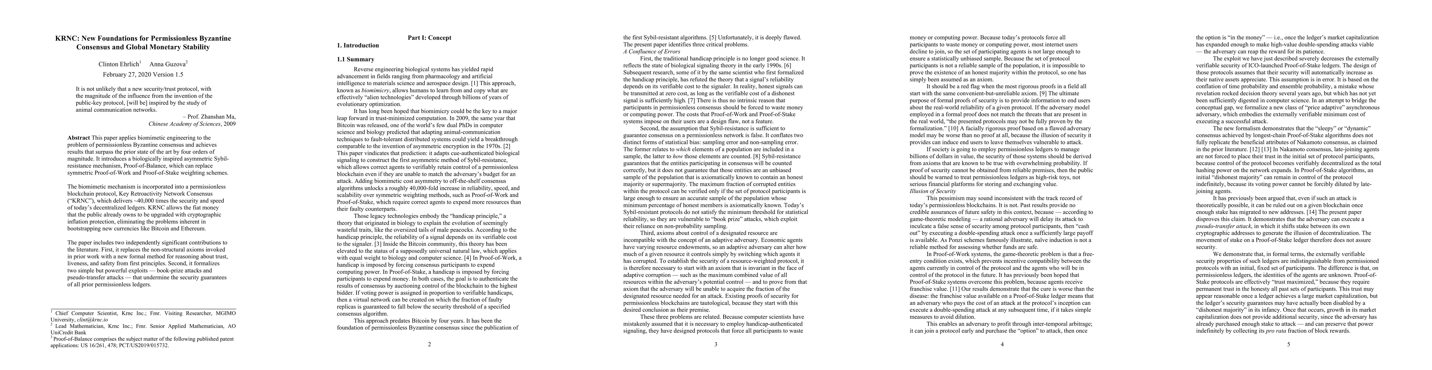 This paper introduces KRNC, a novel permissionless blockchain protocol that employs biomimetic engineering to achieve superior Byzantine consensus and global monetary stability, surpassing current methods by four orders of magnitude. It also identifies and addresses two critical security vulnerabilities in existing permissionless ledgers.