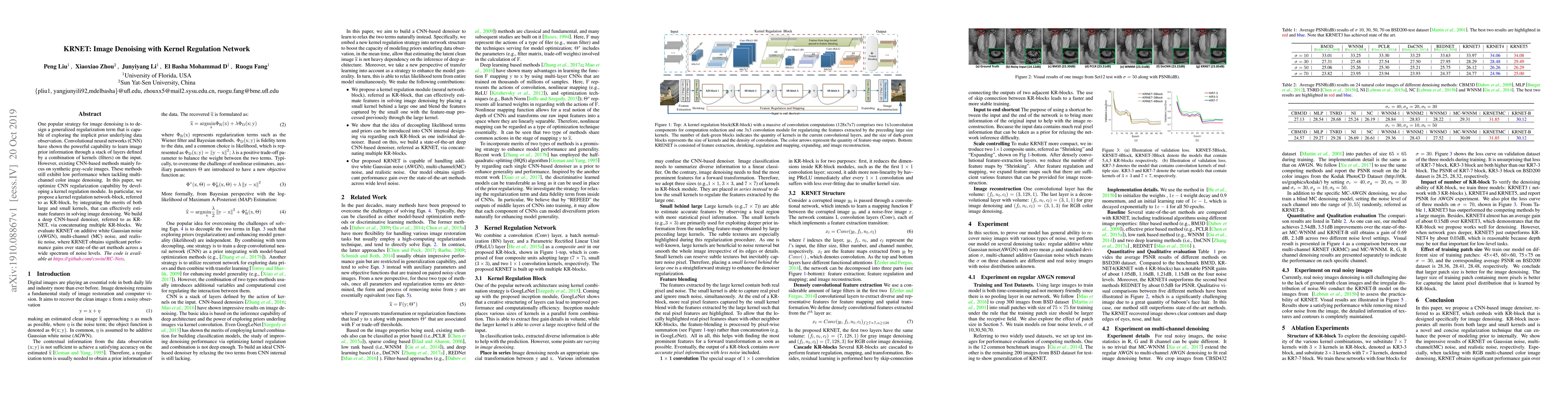 One popular strategy for image denoising is to design a generalized regularization term that is capable of exploring the implicit prior underlying data observation. Convolutional neural networks (CNN) have shown the powerful capability to learn image prior information through a stack of layers defined by a combination of kernels (filters) on the input. However, existing CNN-based methods mainly focus on synthetic gray-scale images. These methods still exhibit low performance when tackling multi-channel color image denoising. In this paper, we optimize CNN regularization capability by developing a kernel regulation module. In particular, we propose a kernel regulation network-block, referred to as KR-block, by integrating the merits of both large and small kernels, that can effectively estimate features in solving image denoising. We build a deep CNN-based denoiser, referred to as KRNET, via concatenating multiple KR-blocks. We evaluate KRNET on additive white Gaussian noise (AWGN), multi-channel (MC) noise, and realistic noise, where KRNET obtains significant performance gains over state-of-the-art methods across a wide spectrum of noise levels.