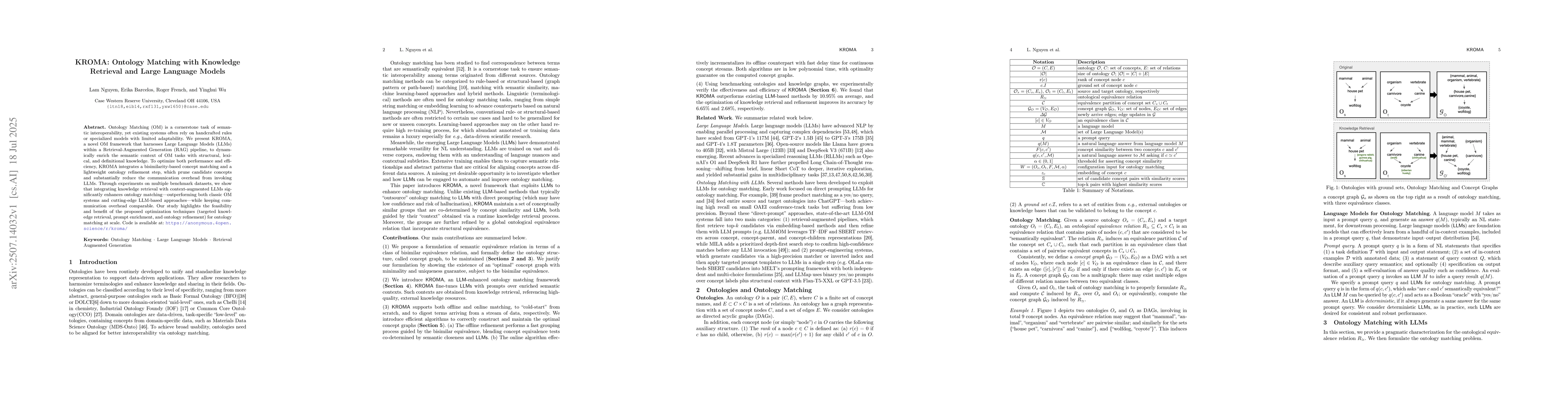 Ontology Matching (OM) is a cornerstone task of semantic interoperability, yet existing systems often rely on handcrafted rules or specialized models with limited adaptability. We present KROMA, a novel OM framework that harnesses Large Language Models (LLMs) within a Retrieval-Augmented Generation (RAG) pipeline to dynamically enrich the semantic context of OM tasks with structural, lexical, and definitional knowledge. To optimize both performance and efficiency, KROMA integrates a bisimilarity-based concept matching and a lightweight ontology refinement step, which prune candidate concepts and substantially reduce the communication overhead from invoking LLMs. Through experiments on multiple benchmark datasets, we show that integrating knowledge retrieval with context-augmented LLMs significantly enhances ontology matching, outperforming both classic OM systems and cutting-edge LLM-based approaches while keeping communication overhead comparable. Our study highlights the feasibility and benefit of the proposed optimization techniques (targeted knowledge retrieval, prompt enrichment, and ontology refinement) for ontology matching at scale.