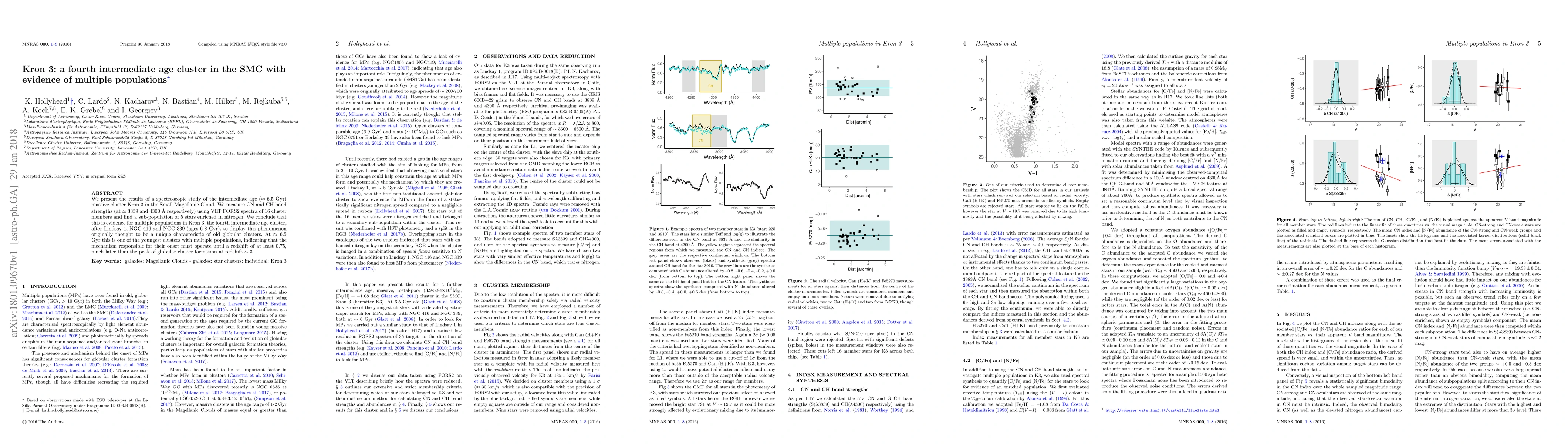This study identifies a sub-population of nitrogen-enriched stars in the intermediate age cluster Kron 3 in the Small Magellanic Cloud, providing evidence of multiple stellar populations. This discovery suggests that the mechanisms responsible for such populations operate much later in the universe than previously thought, extending to at least redshift 0.75.