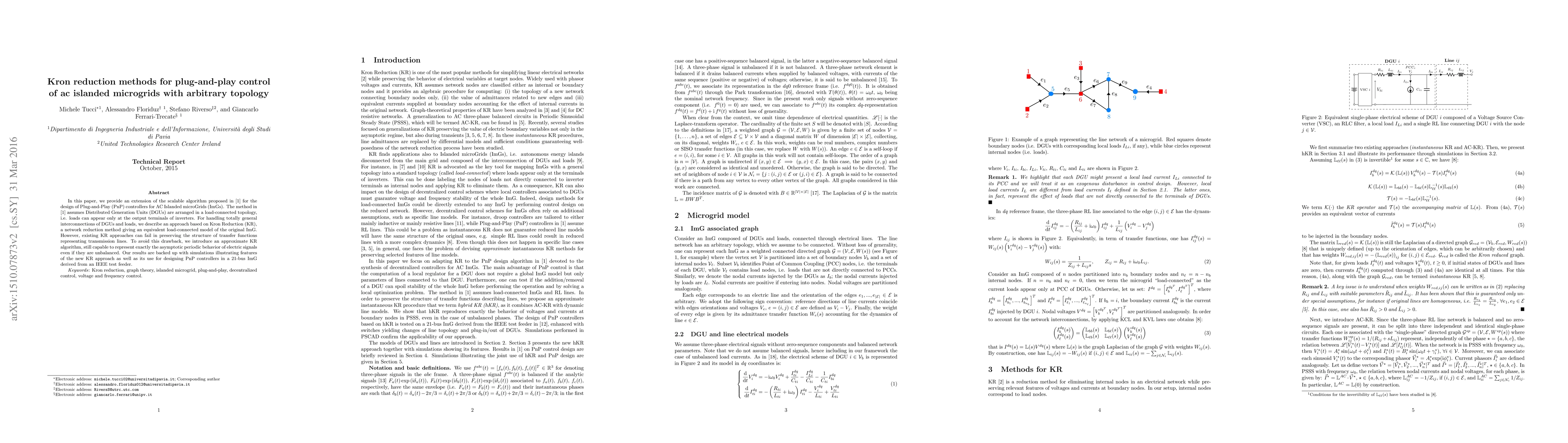 In this paper, we provide an extension of the scalable algorithm proposed in (Riverso et al., 2015) for the design of Plug-and-Play (PnP) controllers for AC Islanded microGrids (ImGs). The method in (Riverso et al., 2015) assumes DGUs are arranged in a load-connected topology, i.e. loads can appear only at the output terminals of inverters. For handling totally general interconnections of DGUs and loads, we describe an approach based on Kron Reduction (KR), a network reduction method giving an equivalent load-connected model of the original ImG. However, existing KR approaches can fail in preserving the structure of transfer functions representing transmission lines. To avoid this drawback, we introduce an approximate KR algorithm, still capable to represent exactly the asymptotic periodic behavior of electric signals even if they are unbalanced. Our results are backed up with simulations illustrating features of the new KR approach as well as its use for designing PnP controllers in a 21-bus ImG derived from an IEEE test feeder.