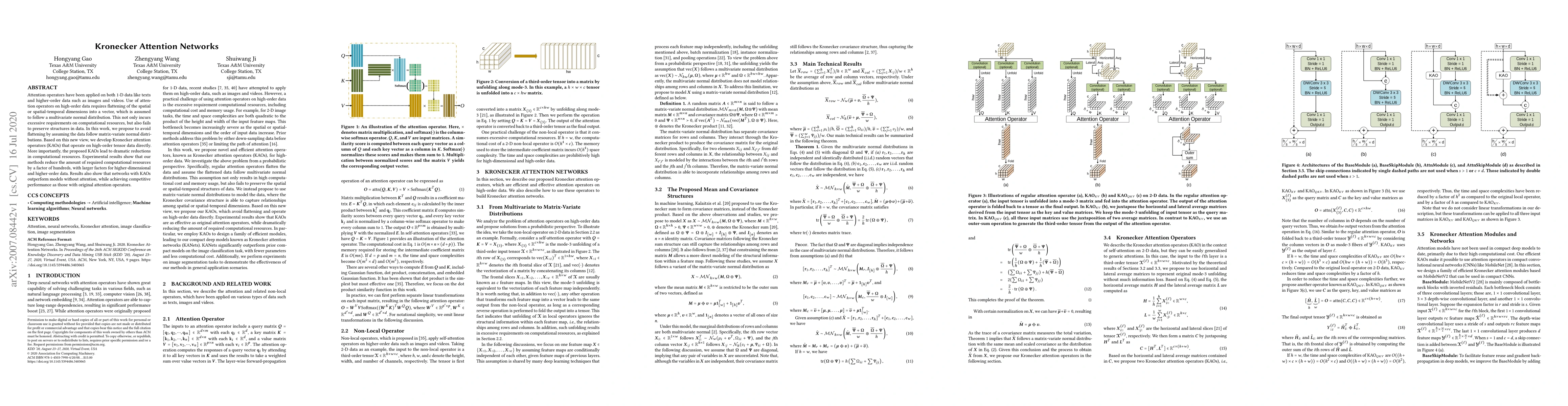 Attention operators have been applied on both 1-D data like texts and higher-order data such as images and videos. Use of attention operators on high-order data requires flattening of the spatial or spatial-temporal dimensions into a vector, which is assumed to follow a multivariate normal distribution. This not only incurs excessive requirements on computational resources, but also fails to preserve structures in data. In this work, we propose to avoid flattening by assuming the data follow matrix-variate normal distributions. Based on this new view, we develop Kronecker attention operators (KAOs) that operate on high-order tensor data directly. More importantly, the proposed KAOs lead to dramatic reductions in computational resources. Experimental results show that our methods reduce the amount of required computational resources by a factor of hundreds, with larger factors for higher-dimensional and higher-order data. Results also show that networks with KAOs outperform models without attention, while achieving competitive performance as those with original attention operators.