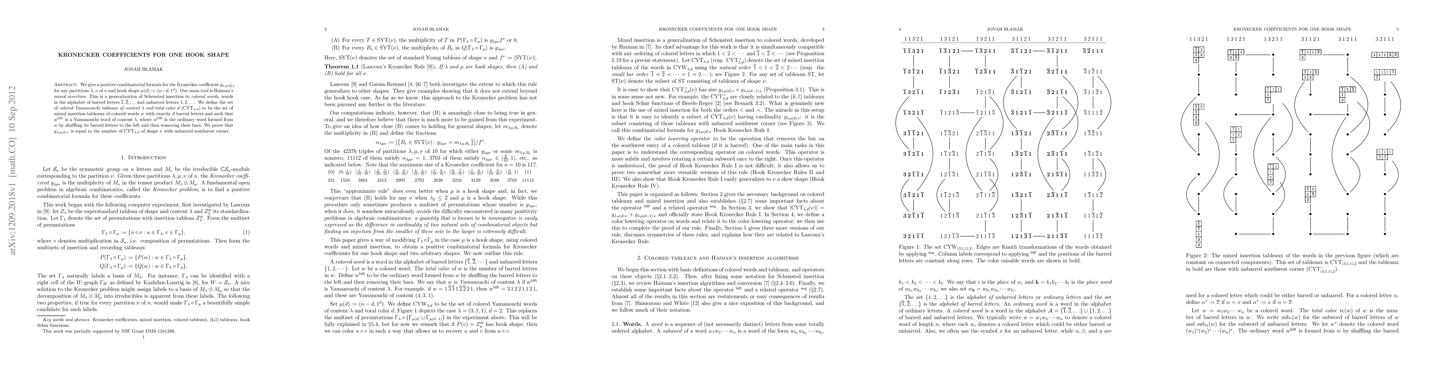This paper provides a positive combinatorial formula for the Kronecker coefficient \( g_{\lambda \mu(d) \nu} \) for partitions \(\lambda\), \(\nu\) of \(n\) and a hook shape \(\mu(d)\). The authors use Haiman's mixed insertion technique to count the number of colored Yamanouchi tableaux of content \(\lambda\) and total color \(d\), establishing a connection between these tableaux and the Kronecker coefficients.