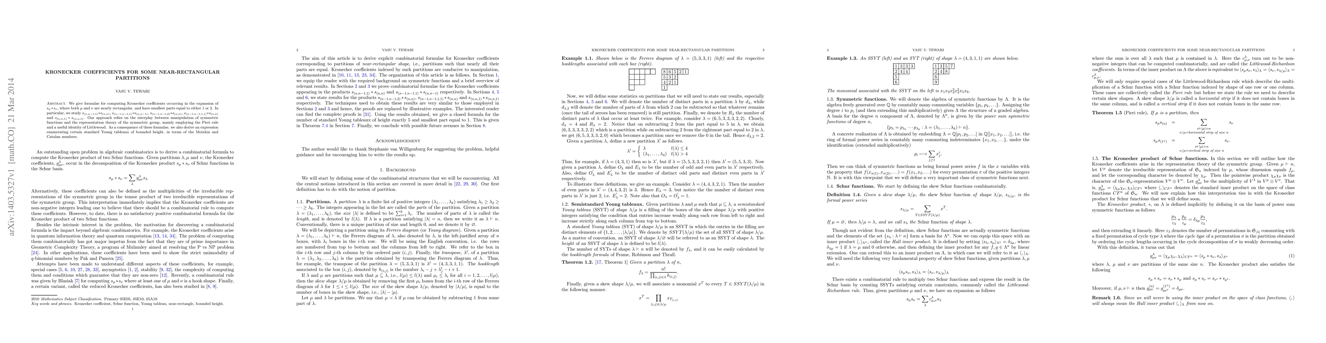 This paper presents formulas for Kronecker coefficients in the expansion of nearly rectangular partitions, specifically focusing on combinations like $s_{(n,n-1,1)}*s_{(n,n)}$ and $s_{(n-1,n-1,1,1)}*s_{(n,n)}$. The research leverages symmetric function manipulation and representation theory, using the Pieri rule and Littlewood's identity, and results in an enumeration of certain standard Young tableaux linked to Motzkin and Catalan numbers.