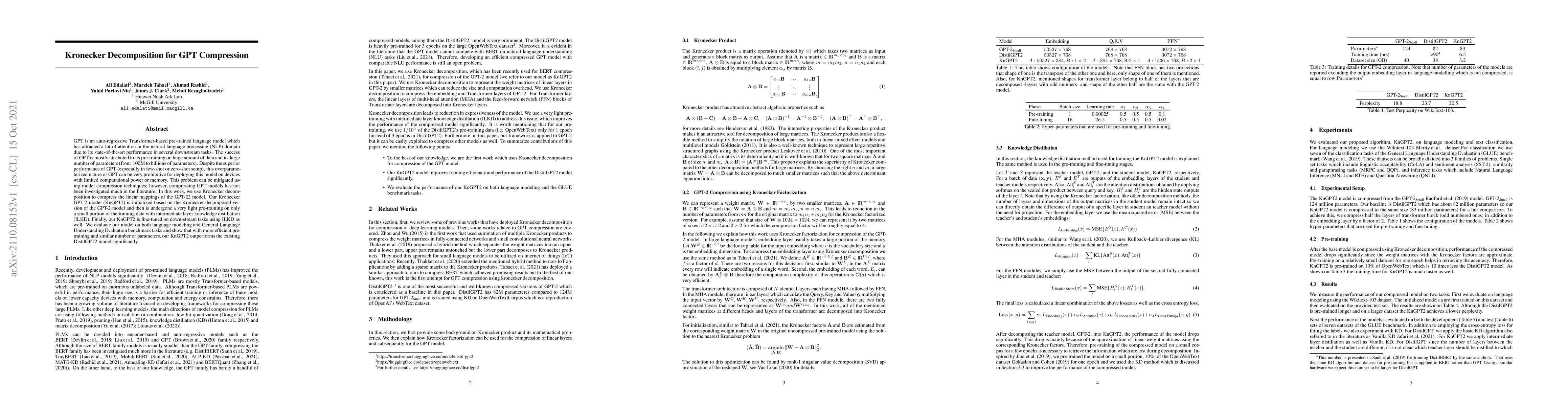 GPT is an auto-regressive Transformer-based pre-trained language model which has attracted a lot of attention in the natural language processing (NLP) domain due to its state-of-the-art performance in several downstream tasks. The success of GPT is mostly attributed to its pre-training on huge amount of data and its large number of parameters (from ~100M to billions of parameters). Despite the superior performance of GPT (especially in few-shot or zero-shot setup), this overparameterized nature of GPT can be very prohibitive for deploying this model on devices with limited computational power or memory. This problem can be mitigated using model compression techniques; however, compressing GPT models has not been investigated much in the literature. In this work, we use Kronecker decomposition to compress the linear mappings of the GPT-22 model. Our Kronecker GPT-2 model (KnGPT2) is initialized based on the Kronecker decomposed version of the GPT-2 model and then is undergone a very light pre-training on only a small portion of the training data with intermediate layer knowledge distillation (ILKD). Finally, our KnGPT2 is fine-tuned on down-stream tasks using ILKD as well. We evaluate our model on both language modeling and General Language Understanding Evaluation benchmark tasks and show that with more efficient pre-training and similar number of parameters, our KnGPT2 outperforms the existing DistilGPT2 model significantly.