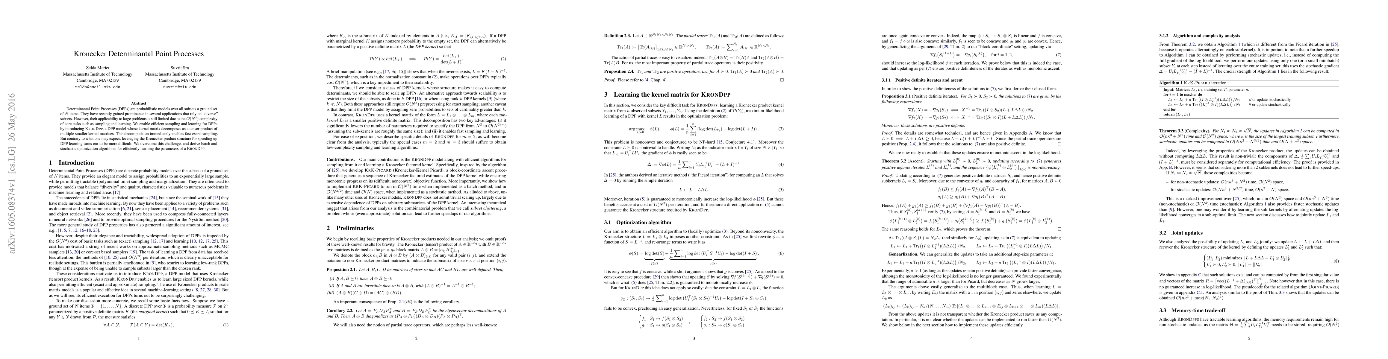 This paper introduces KronDPP, a variant of Determinantal Point Processes (DPPs) that leverages Kronecker product structures to enable efficient sampling and learning. The decomposition of the kernel matrix into smaller components facilitates fast exact sampling, while novel batch and stochastic optimization algorithms address the challenge of efficiently learning the parameters.