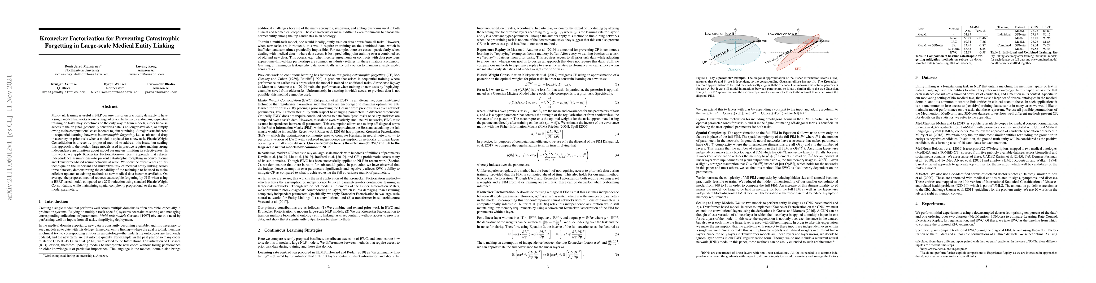 Multi-task learning is useful in NLP because it is often practically desirable to have a single model that works across a range of tasks. In the medical domain, sequential training on tasks may sometimes be the only way to train models, either because access to the original (potentially sensitive) data is no longer available, or simply owing to the computational costs inherent to joint retraining. A major issue inherent to sequential learning, however, is catastrophic forgetting, i.e., a substantial drop in accuracy on prior tasks when a model is updated for a new task. Elastic Weight Consolidation is a recently proposed method to address this issue, but scaling this approach to the modern large models used in practice requires making strong independence assumptions about model parameters, limiting its effectiveness. In this work, we apply Kronecker Factorization--a recent approach that relaxes independence assumptions--to prevent catastrophic forgetting in convolutional and Transformer-based neural networks at scale. We show the effectiveness of this technique on the important and illustrative task of medical entity linking across three datasets, demonstrating the capability of the technique to be used to make efficient updates to existing methods as new medical data becomes available. On average, the proposed method reduces catastrophic forgetting by 51% when using a BERT-based model, compared to a 27% reduction using standard Elastic Weight Consolidation, while maintaining spatial complexity proportional to the number of model parameters.
