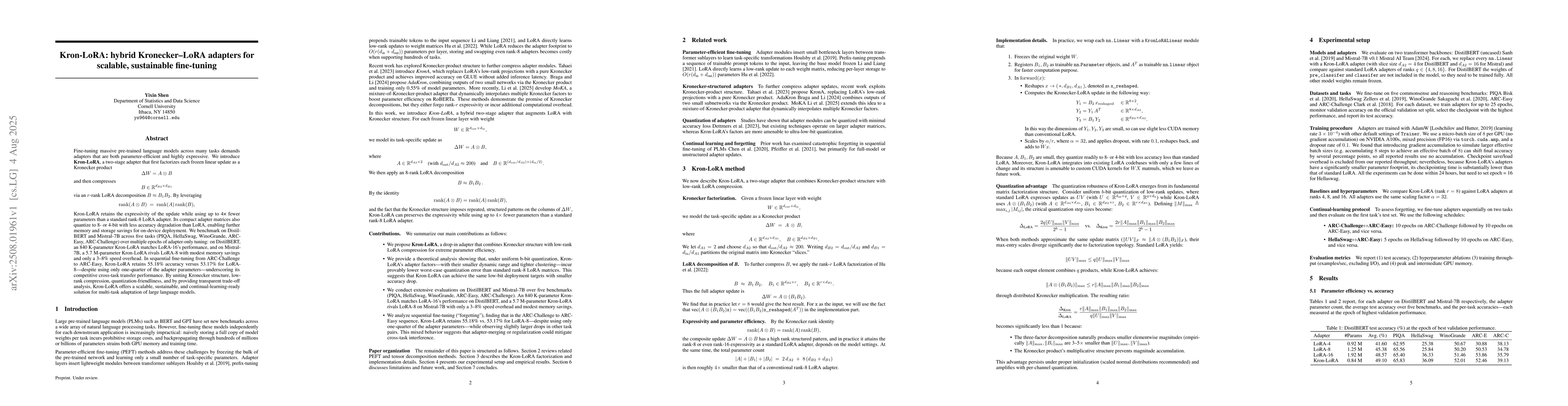 Fine-tuning massive pre-trained language models across many tasks demands adapters that are both parameter-efficient and highly expressive. We introduce \textbf{Kron-LoRA}, a two-stage adapter that first factorizes each frozen linear update as a Kronecker product \[ \Delta W = A \otimes B \] and then compresses \[ B \in \mathbb{R}^{d_{B2}\times d_{B1}} \] via an \(r\)-rank LoRA decomposition \(B \approx B_{1}B_{2}\). By leveraging \[ \mathrm{rank}(A \otimes B) \;=\; \mathrm{rank}(A)\,\mathrm{rank}(B), \] Kron-LoRA retains the expressivity of the update while using up to $4\!\times\!$ fewer parameters than a standard rank-8 LoRA adapter. Its compact adapter matrices also quantize to 8- or 4-bit with less accuracy degradation than LoRA, enabling further memory and storage savings for on-device deployment. We benchmark on DistilBERT and Mistral-7B across five tasks (PIQA, HellaSwag, WinoGrande, ARC-Easy, ARC-Challenge) over multiple epochs of adapter-only tuning: on DistilBERT, an 840 K-parameter Kron-LoRA matches LoRA-16's performance, and on Mistral-7B, a 5.7 M-parameter Kron-LoRA rivals LoRA-8 with modest memory savings and only a 3-8\% speed overhead. In sequential fine-tuning from ARC-Challenge to ARC-Easy, Kron-LoRA retains 55.18\% accuracy versus 53.17\% for LoRA-8-despite using only one-quarter of the adapter parameters-underscoring its competitive cross-task transfer performance. By uniting Kronecker structure, low-rank compression, quantization-friendliness, and by providing transparent trade-off analysis, Kron-LoRA offers a scalable, sustainable, and continual-learning-ready solution for multi-task adaptation of large language models.
