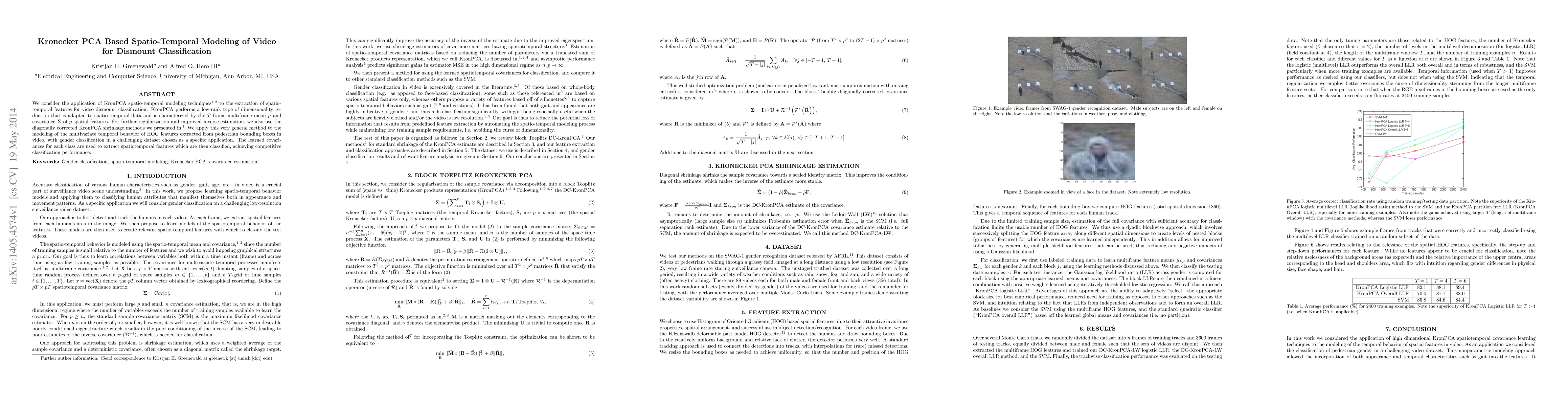 This paper applies Kronecker PCA (KronPCA) for spatio-temporal modeling to extract features from video for dismount classification. The method uses diagonal shrinkage for regularization and achieves competitive classification performance on a challenging dataset.