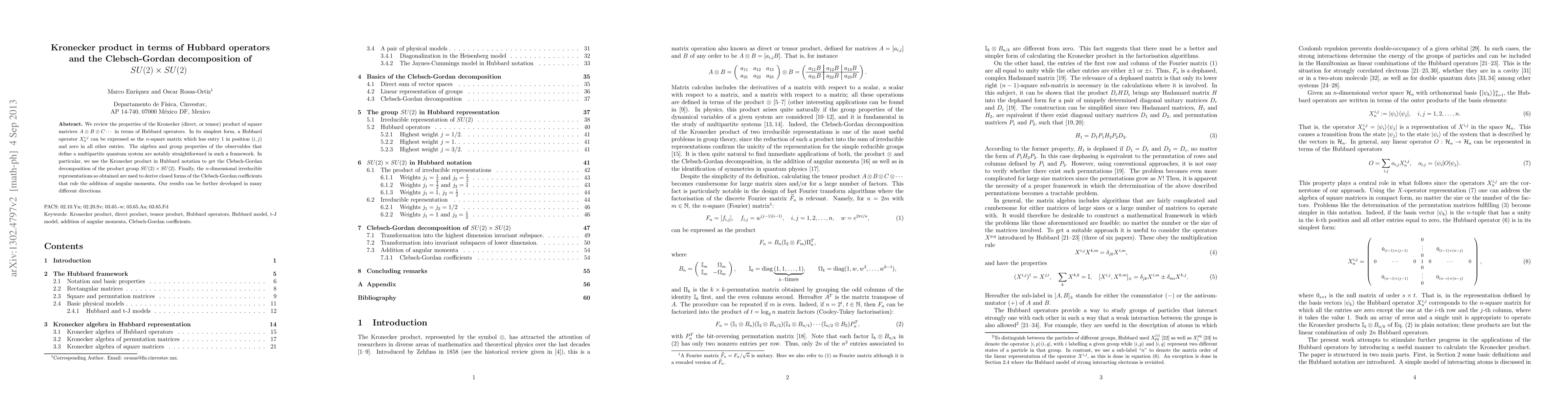 We review the properties of the Kronecker (direct, or tensor) product of square matrices $A \otimes B \otimes C \cdots$ in terms of Hubbard operators. In its simplest form, a Hubbard operator $X_n^{i,j}$ can be expressed as the $n$-square matrix which has entry 1 in position $(i,j)$ and zero in all other entries. The algebra and group properties of the observables that define a multipartite quantum system are notably straightforward in such a framework. In particular, we use the Kronecker product in Hubbard notation to get the Clebsch-Gordan decomposition of the product group $SU(2) \times SU(2)$. Finally, the $n$-dimensional irreducible representations so obtained are used to derive closed forms of the Clebsch-Gordan coefficients that rule the addition of angular momenta. Our results can be further developed in many different directions.