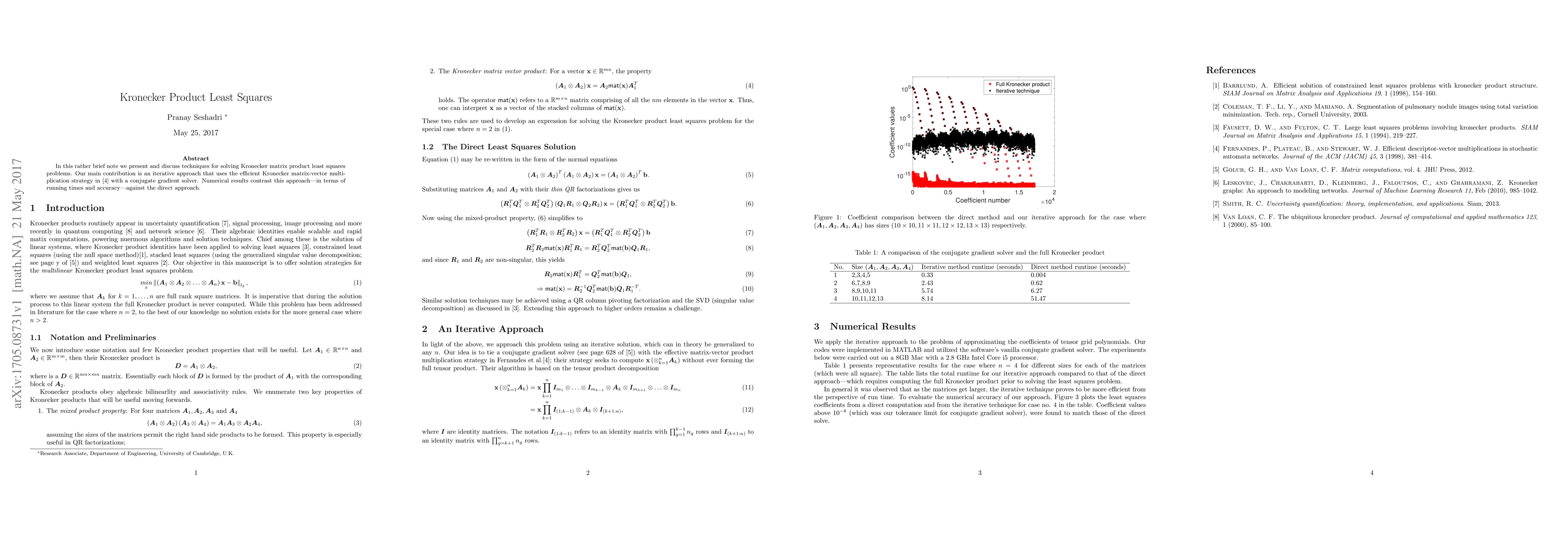 This paper proposes an iterative method for solving Kronecker product least squares problems, utilizing the efficient Kronecker matrix-vector multiplication and a conjugate gradient solver. The method's performance is compared to direct approaches in terms of running time and accuracy.