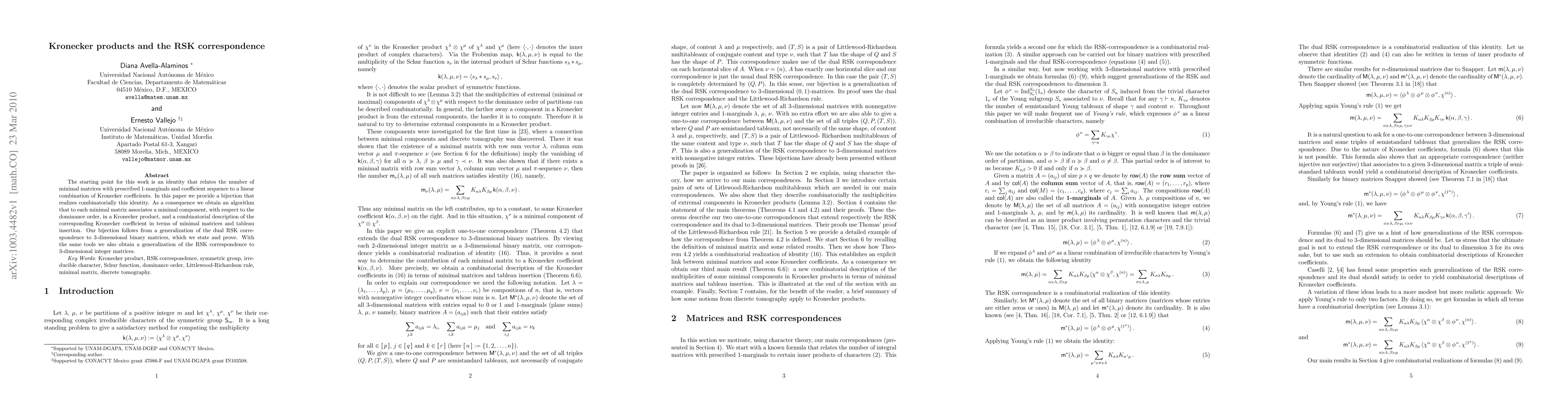 This paper presents a combinatorial bijection that verifies an identity linking minimal matrices and Kronecker coefficients, and introduces a generalized RSK correspondence for 3-dimensional binary and integer matrices, leading to an algorithm relating minimal matrices to Kronecker products.