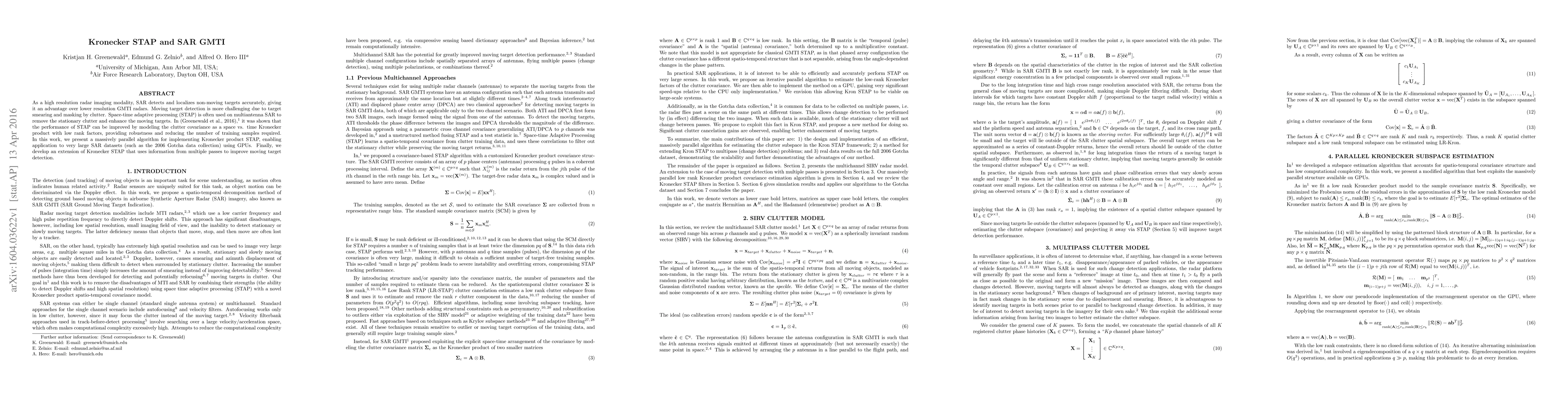 As a high resolution radar imaging modality, SAR detects and localizes non-moving targets accurately, giving it an advantage over lower resolution GMTI radars. Moving target detection is more challenging due to target smearing and masking by clutter. Space-time adaptive processing (STAP) is often used on multiantenna SAR to remove the stationary clutter and enhance the moving targets. In (Greenewald et al., 2016) it was shown that the performance of STAP can be improved by modeling the clutter covariance as a space vs. time Kronecker product with low rank factors, providing robustness and reducing the number of training samples required. In this work, we present a massively parallel algorithm for implementing Kronecker product STAP, enabling application to very large SAR datasets (such as the 2006 Gotcha data collection) using GPUs. Finally, we develop an extension of Kronecker STAP that uses information from multiple passes to improve moving target detection.