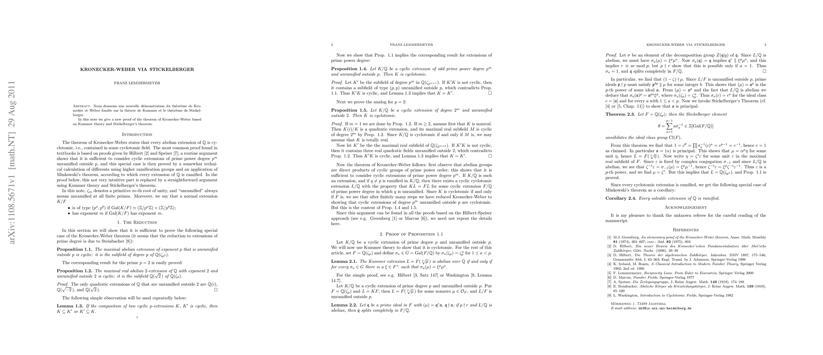 This paper provides a new proof of the Kronecker-Weber theorem using Kummer theory and Stickelberger's theorem, offering an alternative approach to the classical method.