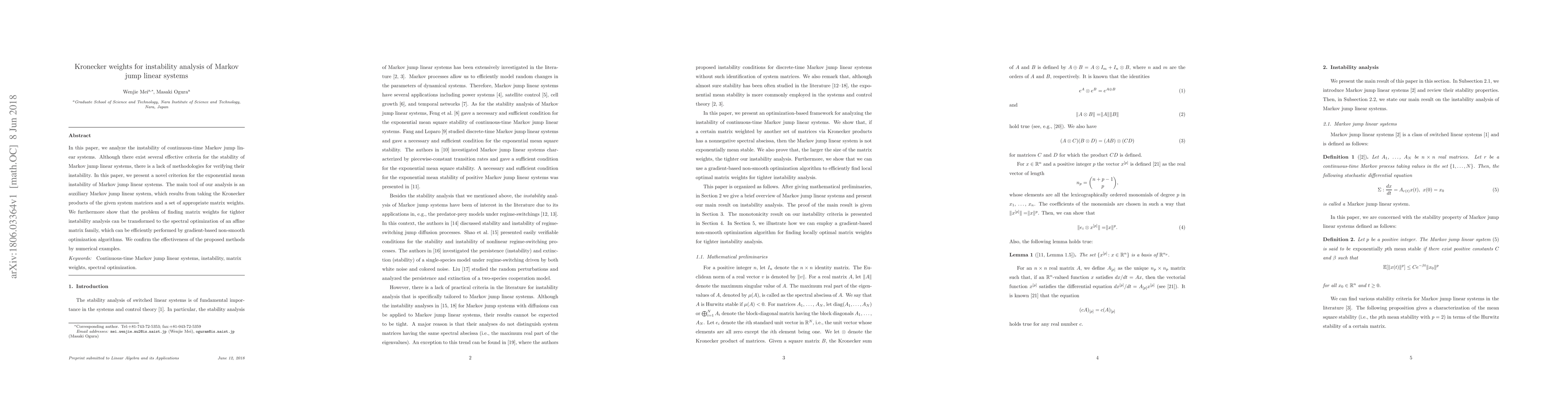 This paper introduces a novel criterion for analyzing the exponential mean instability of continuous-time Markov jump linear systems using Kronecker weights and auxiliary Markov jump linear systems. The method transforms the problem of finding optimal matrix weights into a spectral optimization task, which can be efficiently solved using gradient-based non-smooth optimization algorithms.