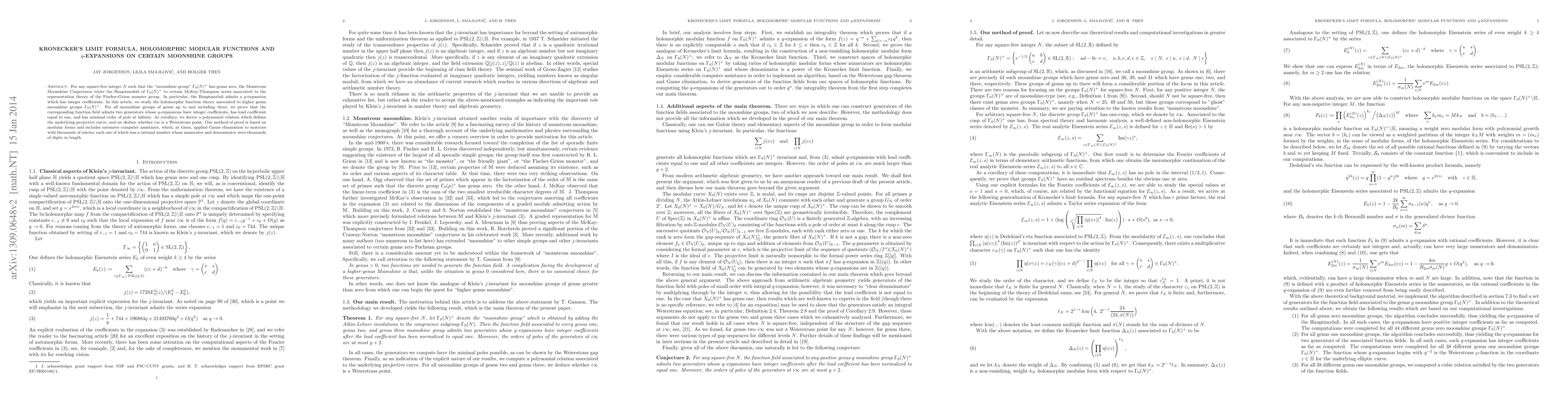 For any square-free integer $N$ such that the "moonshine group" $\Gamma_0(N)^+$ has genus zero, the Monstrous Moonshine Conjectures relate the Hauptmoduli of $\Gamma_0(N)^+$ to certain McKay-Thompson series associated to the representation theory of the Fischer-Griess monster group. In particular, the Hauptmoduli admits a $q$-expansion which has integer coefficients. In this article, we study the holomorphic function theory associated to higher genus moonshine groups $\Gamma_0(N)^+$. For all moonshine groups of genus up to and including three, we prove that the corresponding function field admits two generators whose $q$-expansions have integer coefficients, has lead coefficient equal to one, and has minimal order of pole at infinity. As corollary, we derive a polynomial relation which defines the underlying projective curve, and we deduce whether $i\infty$ is a Weierstrass point. Our method of proof is based on modular forms and includes extensive computer assistance, which, at times, applied Gauss elimination to matrices with thousands of entries, each one of which was a rational number whose numerator and denominator were thousands of digits in length.