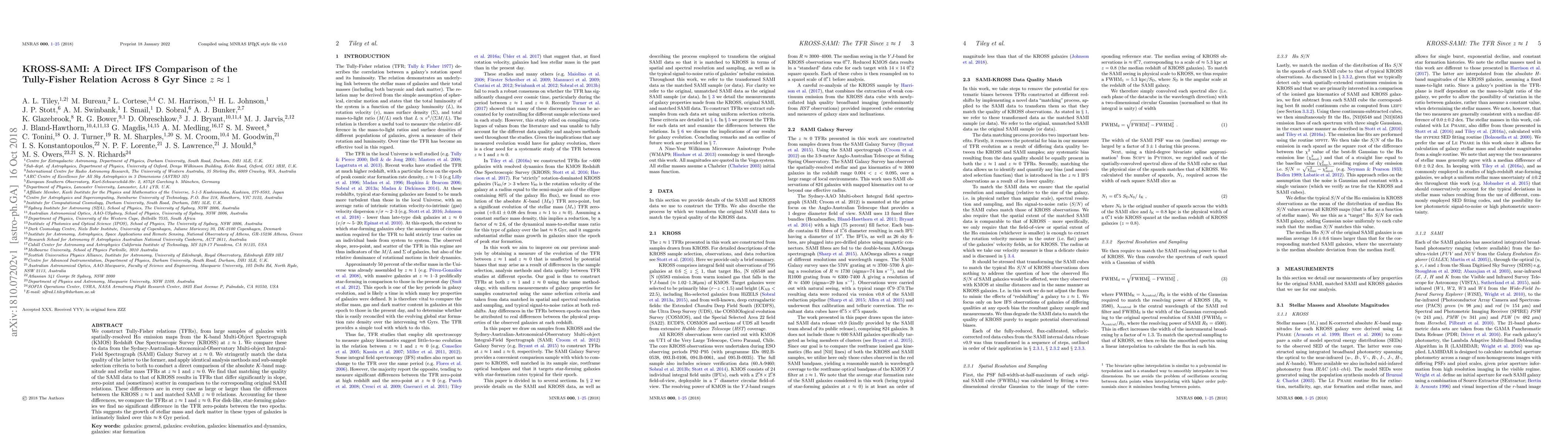 This paper compares Tully-Fisher relations (TFRs) from galaxies at $z\approx1$ (KROSS) and $z\approx0$ (SAMI) using matched data quality and analysis methods. It finds significant differences in TFR slopes and zero-points when SAMI data is matched to KROSS quality, suggesting a strong correlation between stellar mass and dark matter growth in disk-like, star-forming galaxies over an 8 Gyr period.