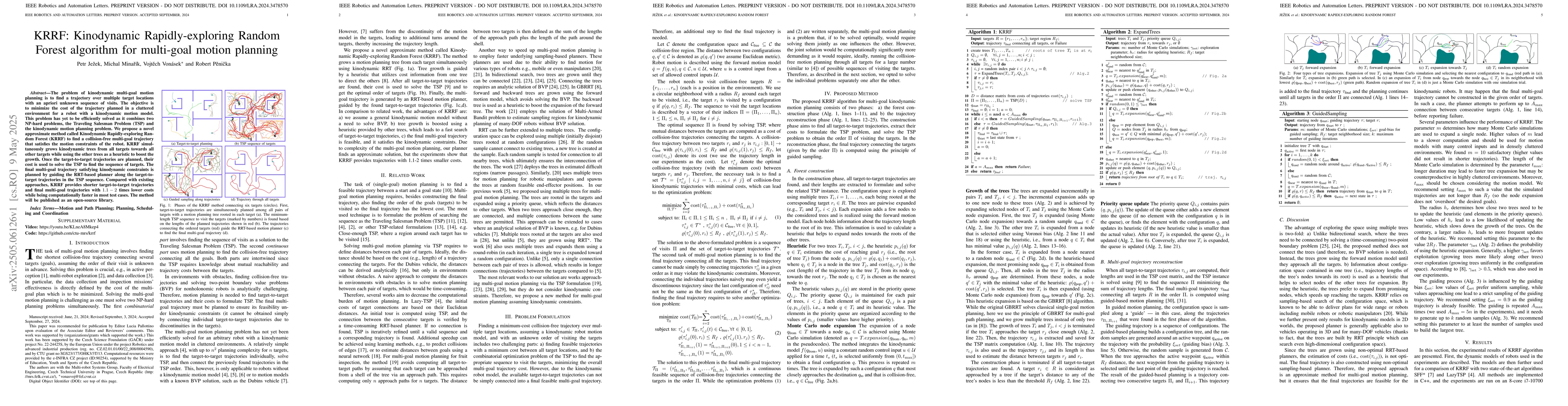The development and evaluation of the Kinodynamic Rapidly-exploring Random Forest (KRRF) algorithm for multi-goal motion planning, which efficiently combines TSP and kinodynamic motion planning.
