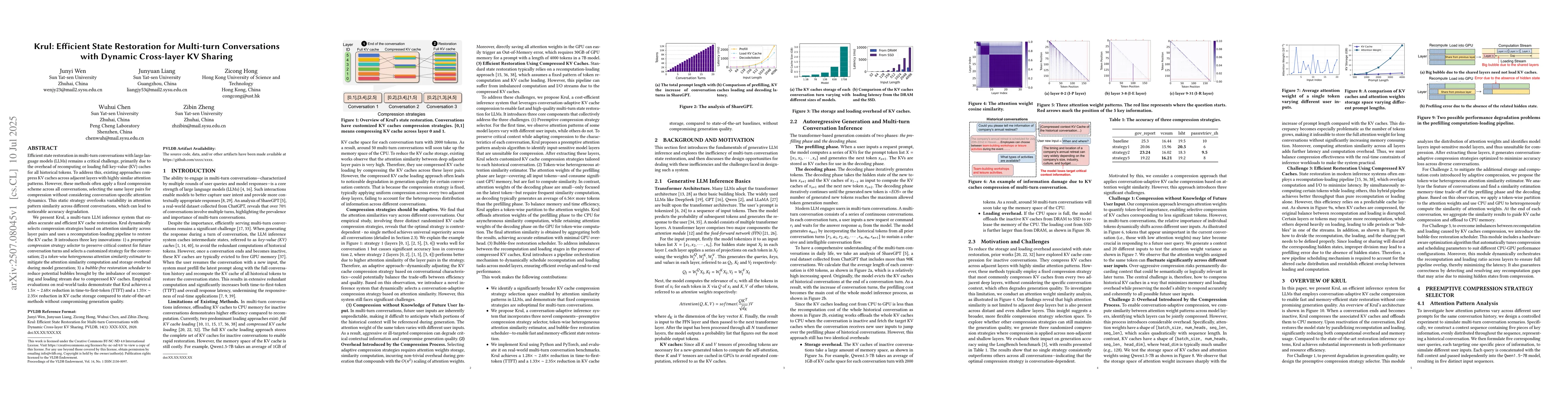 Efficient state restoration in multi-turn conversations with large language models (LLMs) remains a critical challenge, primarily due to the overhead of recomputing or loading full key-value (KV) caches for all historical tokens. To address this, existing approaches compress KV caches across adjacent layers with highly similar attention patterns. However, these methods often apply a fixed compression scheme across all conversations, selecting the same layer pairs for compression without considering conversation-specific attention dynamics. This static strategy overlooks variability in attention pattern similarity across different conversations, which can lead to noticeable accuracy degradation. We present Krul, a multi-turn LLM inference system that enables accurate and efficient KV cache restoration. Krul dynamically selects compression strategies based on attention similarity across layer pairs and uses a recomputation-loading pipeline to restore the KV cache. It introduces three key innovations: 1) a preemptive compression strategy selector to preserve critical context for future conversation turns and selects a customized strategy for the conversation; 2) a token-wise heterogeneous attention similarity estimator to mitigate the attention similarity computation and storage overhead during model generation; 3) a bubble-free restoration scheduler to reduce potential bubbles brought by the imbalance of recomputing and loading stream due to compressed KV caches. Empirical evaluations on real-world tasks demonstrate that Krul achieves a 1.5x-2.68x reduction in time-to-first-token (TTFT) and a 1.33x-2.35x reduction in KV cache storage compared to state-of-the-art methods without compromising generation quality.