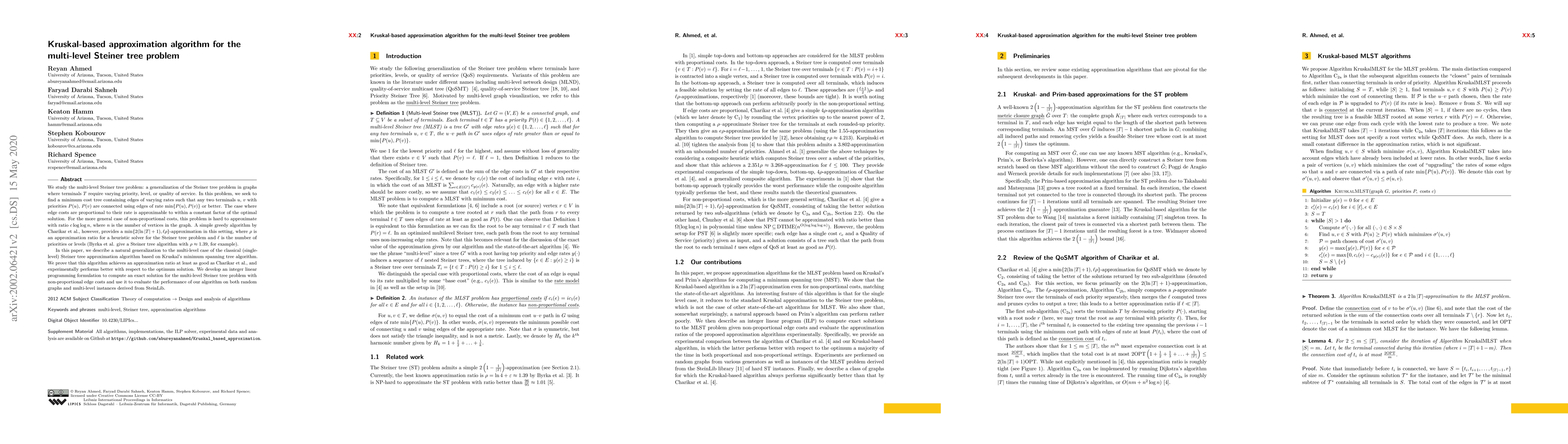 This paper presents a Kruskal-based approximation algorithm for the multi-level Steiner tree problem, achieving an approximation ratio at least as good as existing methods. Experimentally, it outperforms previous algorithms and is evaluated against an integer linear programming formulation for non-proportional edge costs.
