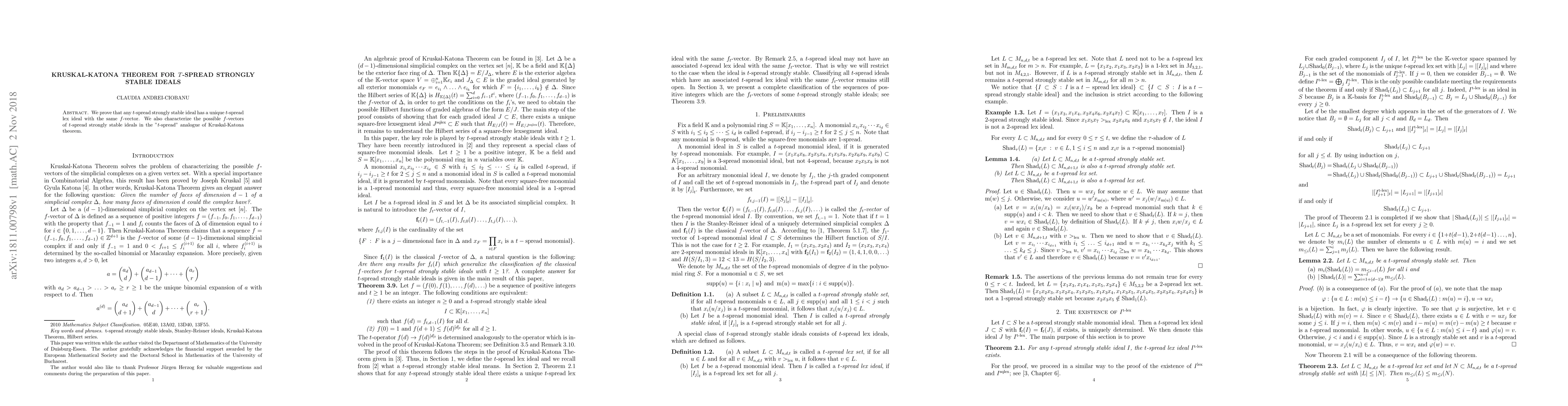 The paper proves the uniqueness of a t-spread lex ideal corresponding to any t-spread strongly stable ideal with the same f-vector, and characterizes the f-vectors of these ideals using a t-spread analogue of Kruskal-Katona theorem.