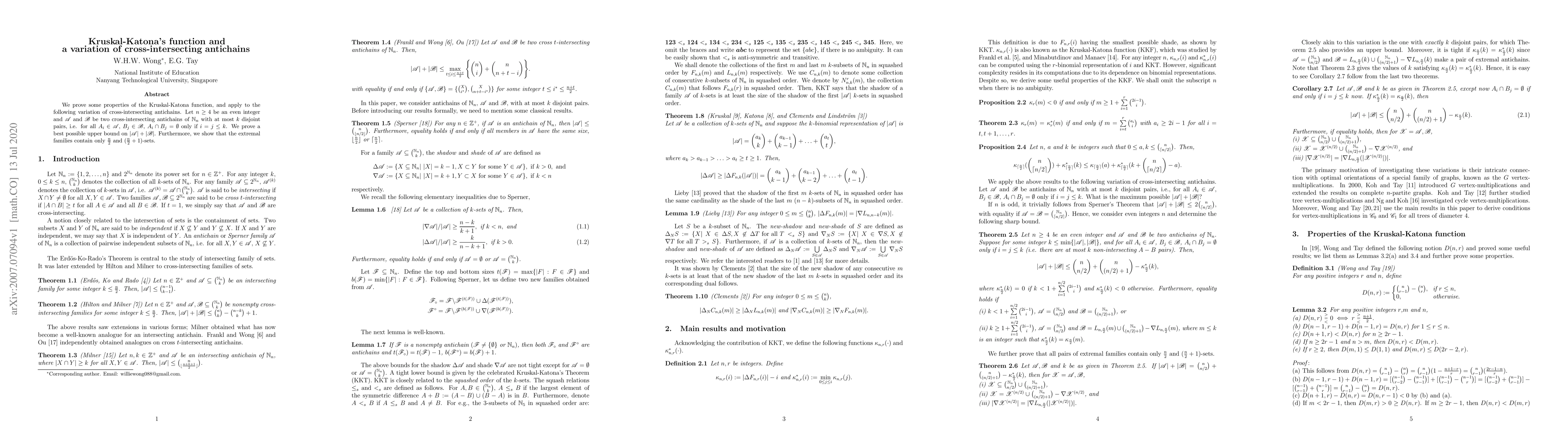 We prove some properties of the Kruskal-Katona function, and apply to the following variation of cross-intersecting antichains. Let $n\ge 4$ be an even integer and $\mathscr{A}$ and $\mathscr{B}$ be two cross-intersecting antichains of $\mathbb{N}_n$ with at most $k$ disjoint pairs, i.e. for all $A_i\in \mathscr{A}$, $B_j\in\mathscr{B}$, $A_i\cap B_j=\emptyset$ only if $i=j\le k$. We prove a best possible upper bound on $|\mathscr{A}|+|\mathscr{B}|$. Furthermore, we show that the extremal families contain only $\frac{n}{2}$ and $(\frac{n}{2}+1)$-sets.