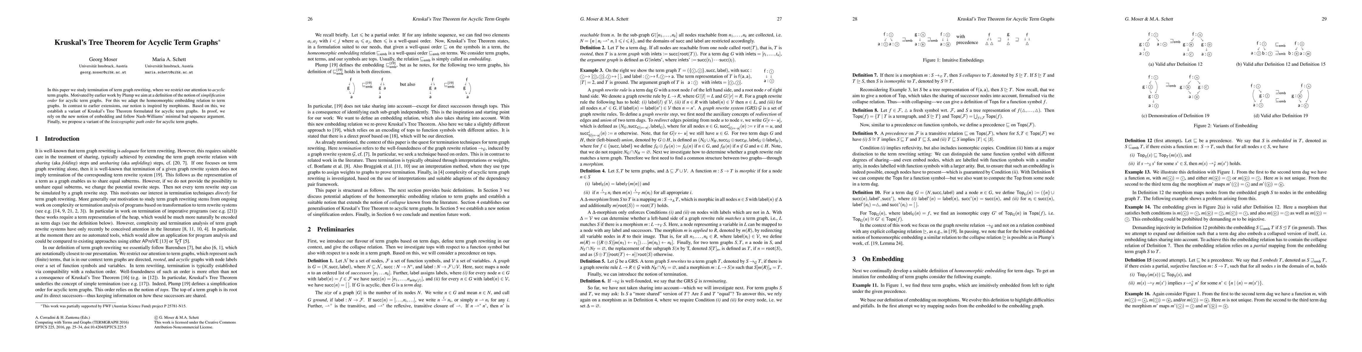 In this paper we study termination of term graph rewriting, where we restrict our attention to acyclic term graphs. Motivated by earlier work by Plump we aim at a definition of the notion of simplification order for acyclic term graphs. For this we adapt the homeomorphic embedding relation to term graphs. In contrast to earlier extensions, our notion is inspired by morphisms. Based on this, we establish a variant of Kruskal's Tree Theorem formulated for acyclic term graphs. In proof, we rely on the new notion of embedding and follow Nash-Williams' minimal bad sequence argument. Finally, we propose a variant of the lexicographic path order for acyclic term graphs.
