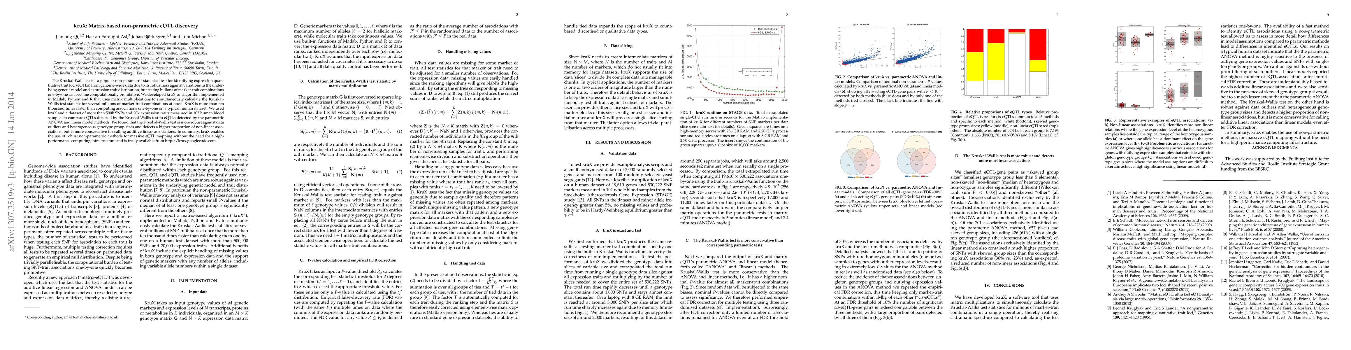 KruX is a fast matrix-based algorithm for non-parametric eQTL discovery using the Kruskal-Wallis test, significantly speeding up computations compared to traditional methods. It detects more robust non-linear associations but is less effective for linear ones.