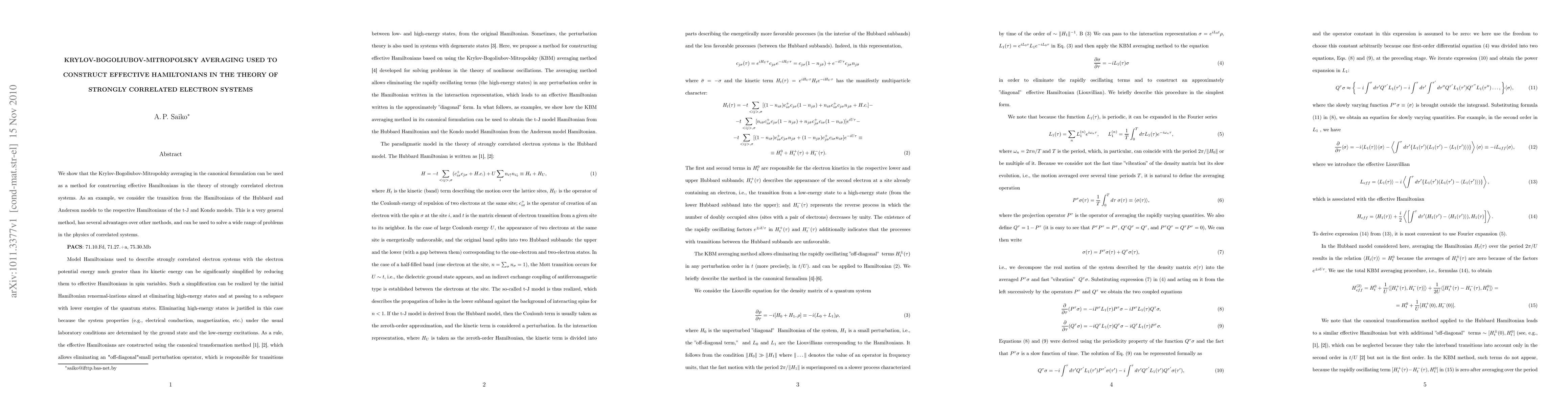 This paper demonstrates the application of Krylov-Bogoliubov-Mitropolsky averaging to construct effective Hamiltonians for strongly correlated electron systems, exemplified by transitions from the Hubbard and Anderson models to the t-J and Kondo models. This method offers advantages over other techniques and is broadly applicable to various problems in correlated systems physics.