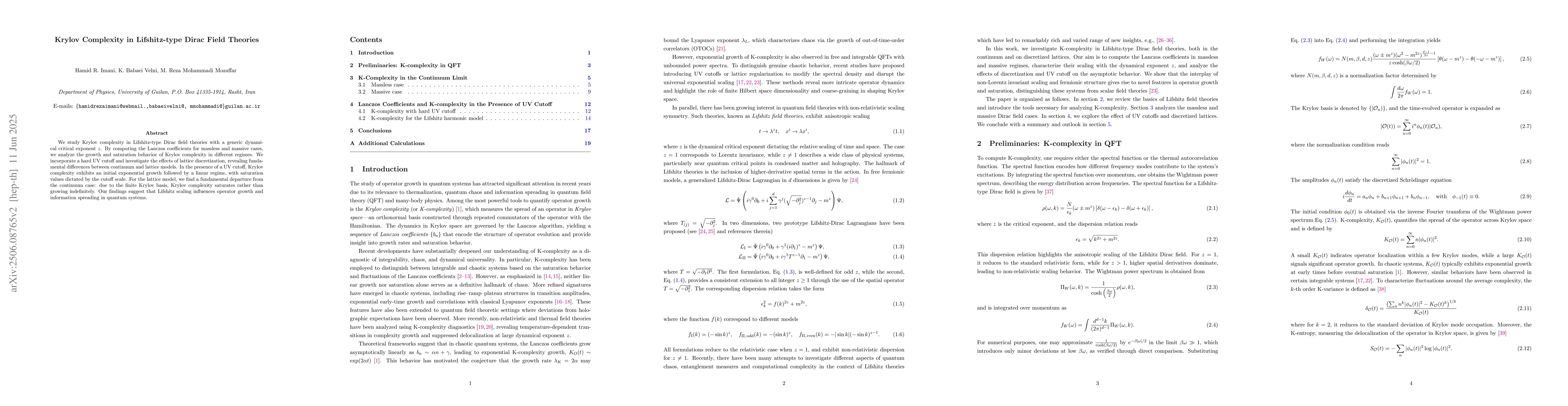 This research investigates Krylov complexity in Lifshitz-type Dirac field theories, computing Lanczos coefficients for massless and massive cases. It reveals that while continuum models show unbounded growth, lattice models saturate due to finite Krylov basis, indicating Lifshitz scaling impacts operator growth and information spreading in quantum systems.