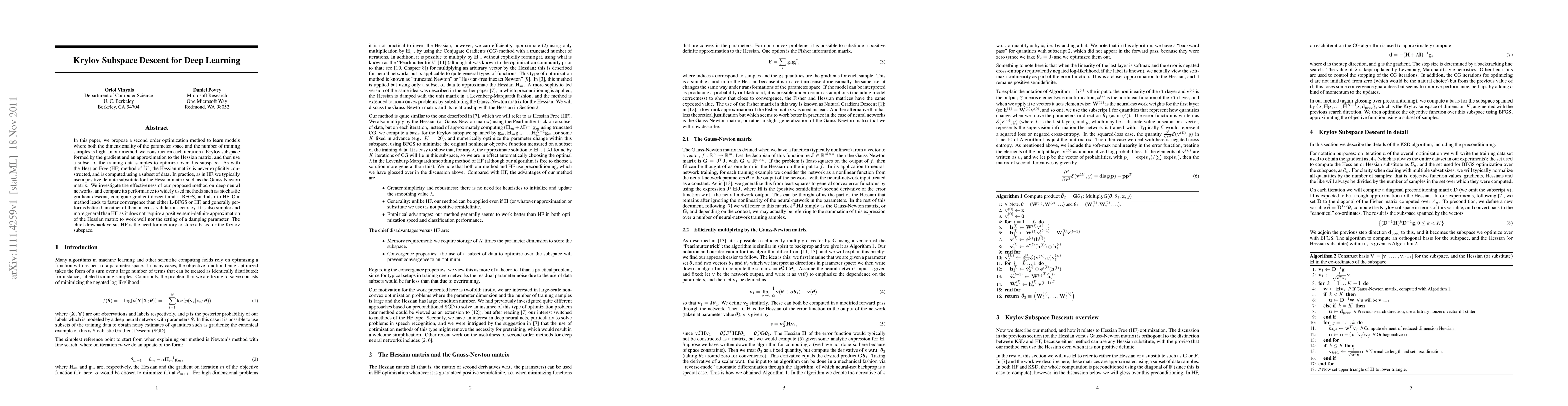 This paper introduces Krylov Subspace Descent, a second-order optimization method for high-dimensional, high-sample deep learning models. It constructs a Krylov subspace using gradient and a Hessian approximation, optimizing with a subset of training data. The method outperforms L-BFGS, Hessian Free, and other methods in convergence speed and cross-validation accuracy, while being simpler and more general, though it requires memory for Krylov subspace basis storage.