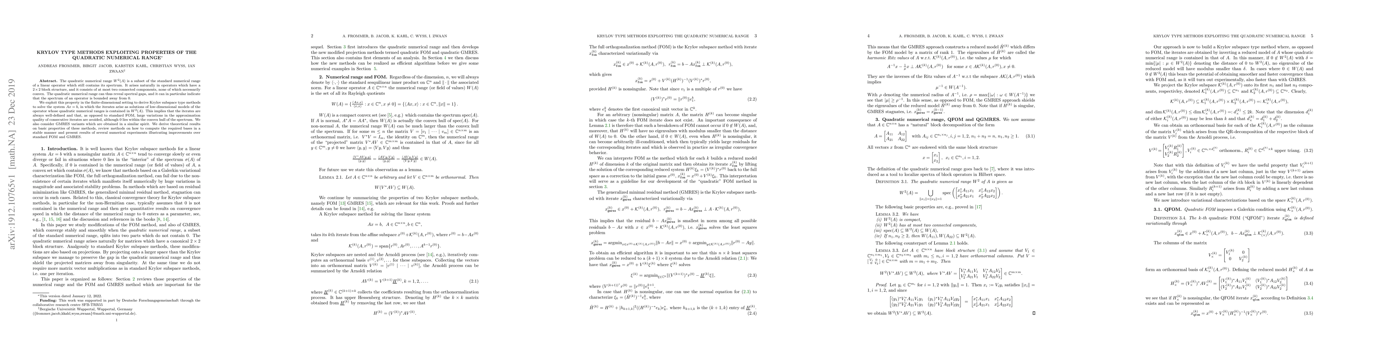 The quadratic numerical range $W^2(A)$ is a subset of the standard numerical range of a linear operator which still contains its spectrum. It arises naturally in operators which have a $2 \times 2$ block structure, and it consists of at most two connected components, none of which necessarily convex. The quadratic numerical range can thus reveal spectral gaps, and it can in particular indicate that the spectrum of an operator is bounded away from $0$. We exploit this property in the finite-dimensional setting to derive Krylov subspace type methods to solve the system $Ax = b$, in which the iterates arise as solutions of low-dimensional models of the operator whose quadratic numerical ranges is contained in $W^2(A)$. This implies that the iterates are always well-defined and that, as opposed to standard FOM, large variations in the approximation quality of consecutive iterates are avoided, although $0$ lies within the convex hull of the spectrum. We also consider GMRES variants which are obtained in a similar spirit. We derive theoretical results on basic properties of these methods, review methods on how to compute the required bases in a stable manner and present results of several numerical experiments illustrating improvements over standard FOM and GMRES.