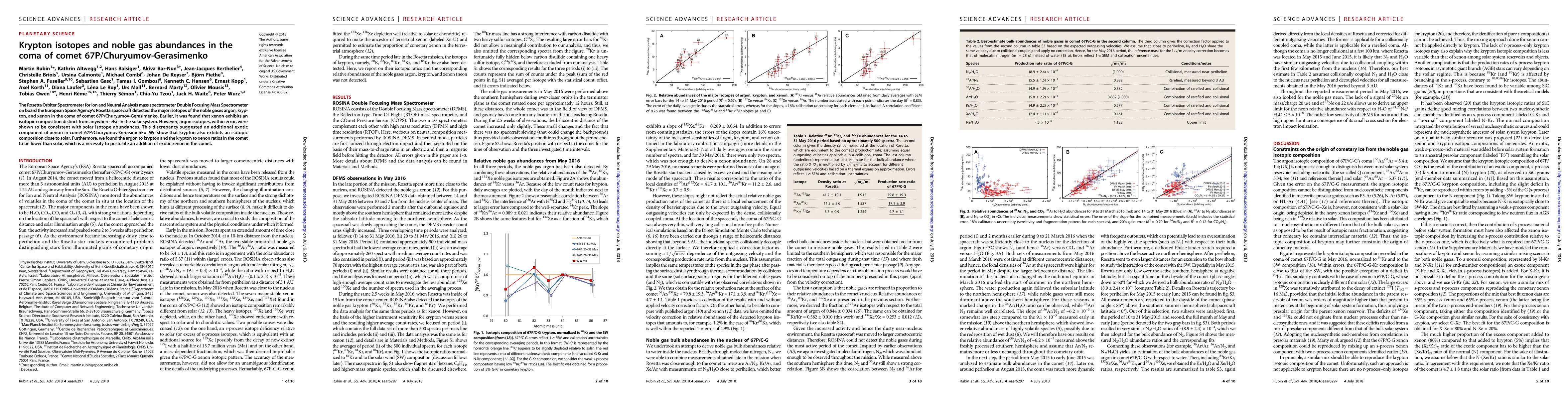 The ROSINA mass spectrometer on ESA's Rosetta spacecraft detected noble gas isotopes in comet 67P/Churyumov-Gerasimenko, showing krypton and argon isotopes close to solar values, while xenon has a distinct isotopic composition, suggesting an exotic component. The observed depletion of argon relative to krypton and krypton relative to xenon supports the need for exotic xenon in the comet.