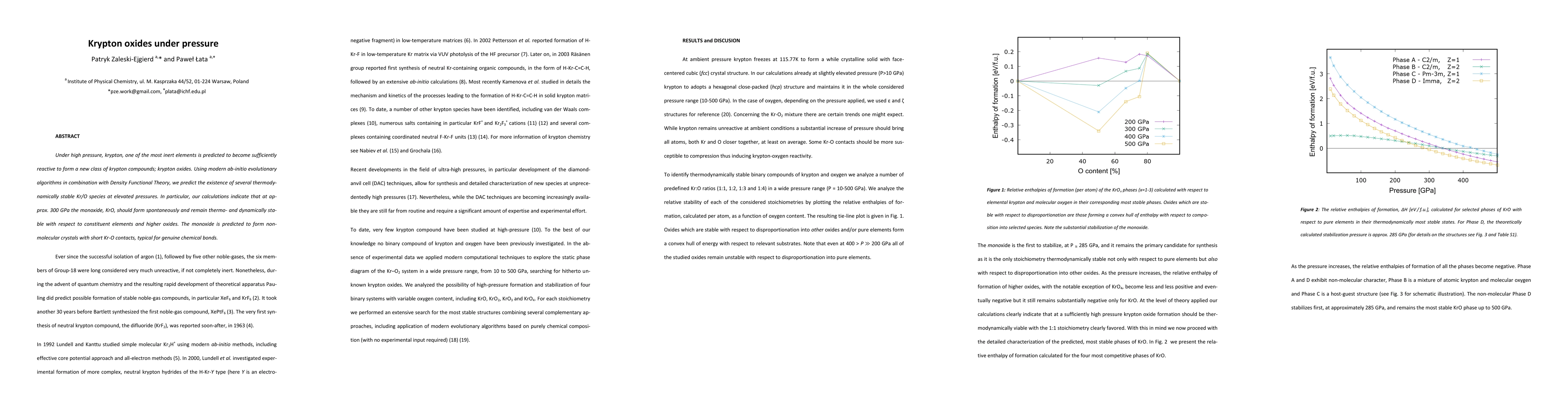 This paper predicts the formation of thermodynamically stable krypton oxides under high pressure using ab-initio evolutionary algorithms and Density Functional Theory. Specifically, it finds that at around 300 GPa, krypton monoxide (KrO) is expected to spontaneously form stable, non-molecular crystals with genuine chemical bonds.