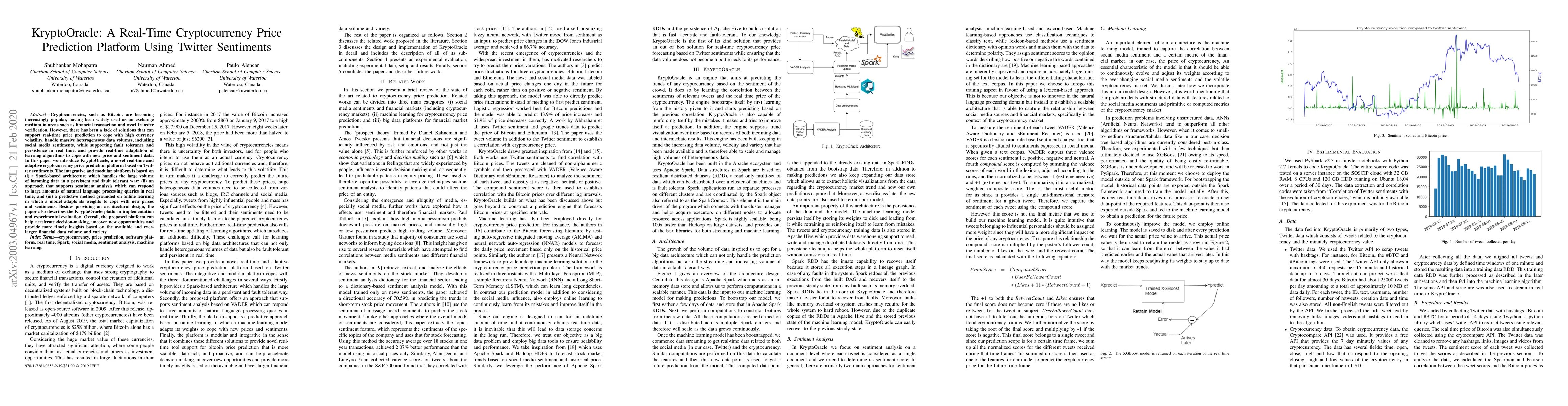 KryptoOracle is a real-time cryptocurrency price prediction platform that leverages Twitter sentiments, utilizing a Spark-based architecture for handling large data volumes and an online learning model for adaptive predictions. The platform aims to provide timely insights and decision support amidst high volatility and massive data influx.