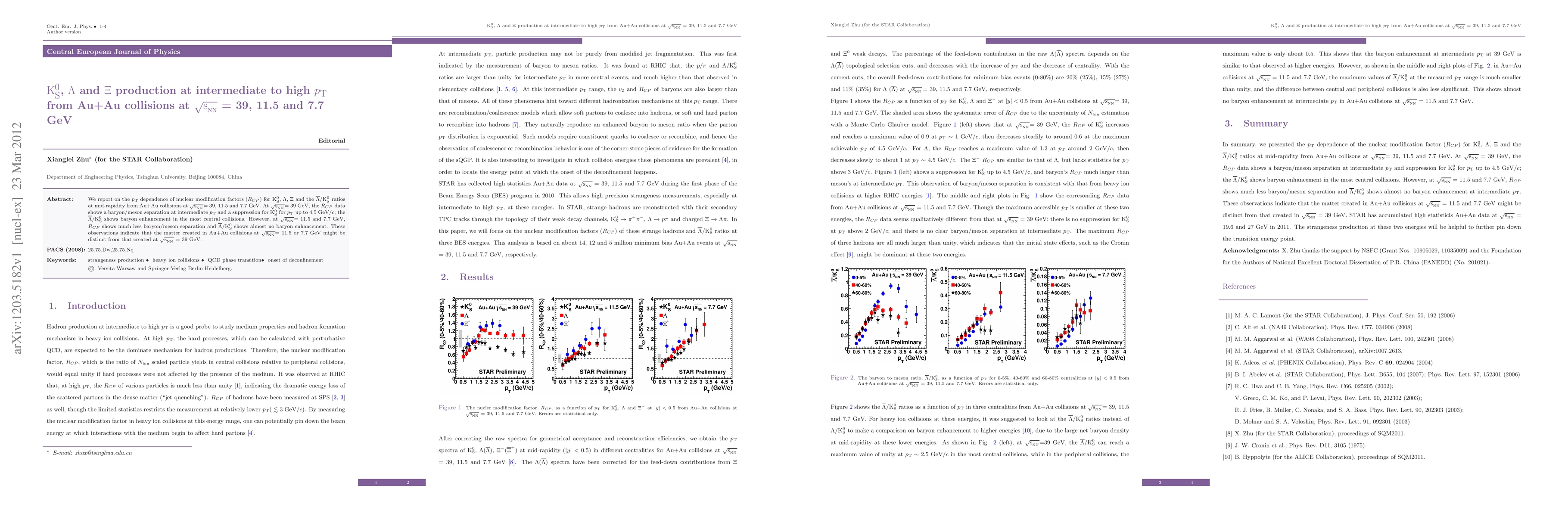 This study investigates the transverse momentum (pT) dependence of nuclear modification factors for Ks, Lambda, Xi, and Anti-Lambda/Ks ratios in Au+Au collisions at different energies. At 39 GeV, significant baryon/meson separation and Ks suppression are observed, while at lower energies (11.5 and 7.7 GeV), these effects are much weaker, suggesting distinct matter states at different collision energies.