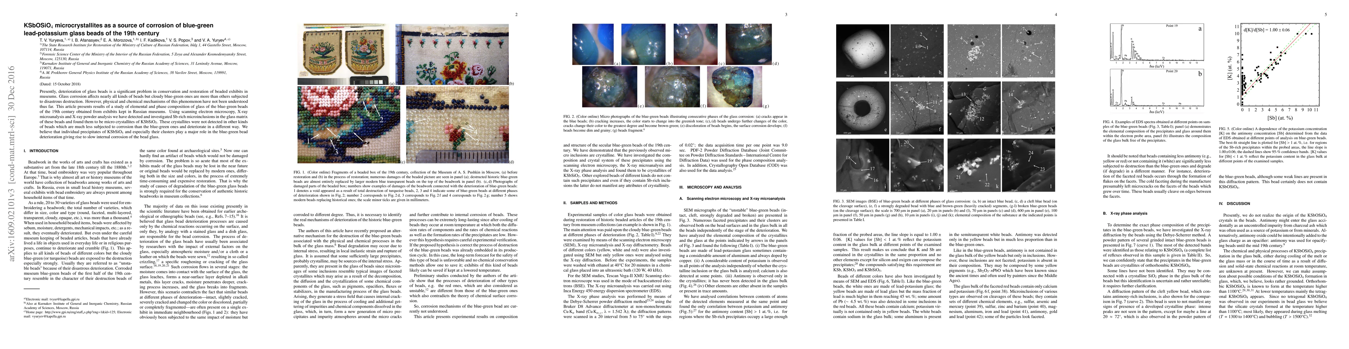 Presently, deterioration of glass beads is a significant problem in conservation and restoration of beaded exhibits in museums. Glass corrosion affects nearly all kinds of beads but cloudy blue-green ones are more than others subjected to disastrous destruction. However, physical and chemical mechanisms of this phenomenon have not been understood thus far. This article presents results of a study of elemental and phase composition of glass of the blue-green beads of the 19th century obtained from exhibits kept in Russian museums. Using scanning electron microscopy, X-ray microanalysis and X-ray powder analysis we have detected and investigated Sb-rich microinclusions in the glass matrix of these beads and found them to be micro crystallites of KSbSiO$_5$. These crystallites were not detected in other kinds of beads which are much less subjected to corrosion than the blue-green ones and deteriorate in a different way. We belive that individual precipitates of KSbSiO$_5$ and especially their clusters play a major role in the blue-green bead deterioration giving rise to slow internal corrosion of the bead glass.