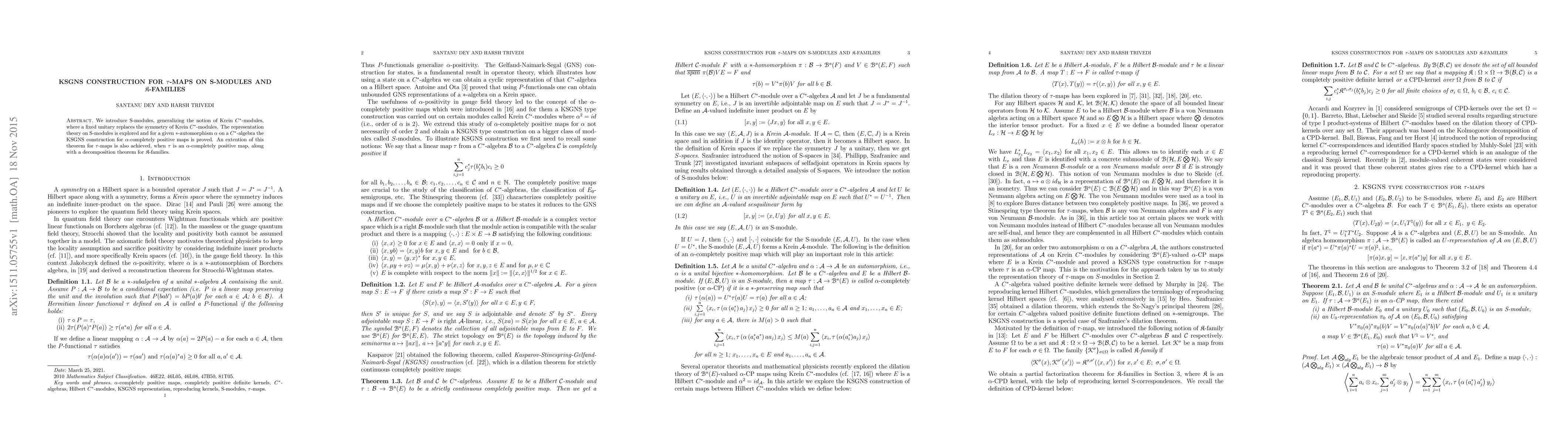 We introduce S-modules, generalizing the notion of Krein $C^*$-modules, where a fixed unitary replaces the symmetry of Krein $C^*$-modules. The representation theory on S-modules is explored and for a given $*$-automorphism $\alpha$ on a $C^*$-algebra the KSGNS construction for $\alpha$-completely positive maps is proved. An extention of this theorem for $\tau$-maps is also achieved, when $\tau$ is an $\alpha$-completely positive map, along with a decomposition theorem for $\mathfrak K$-families.