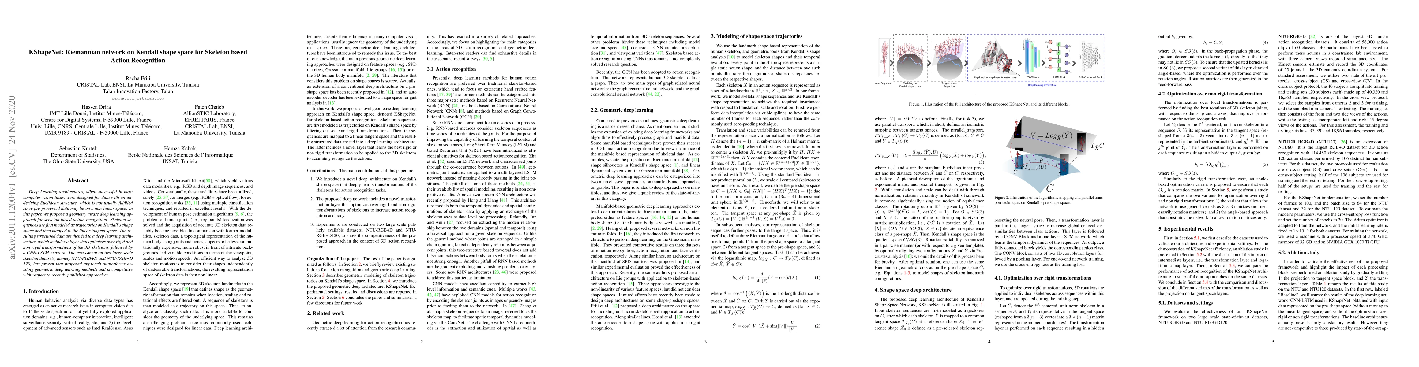 This paper introduces KShapeNet, a deep learning method for skeleton-based action recognition. It models skeleton sequences as trajectories on Kendall's shape space, optimizes over rigid and non-rigid transformations, and uses a CNN-LSTM network, outperforming existing geometric deep learning methods on NTU-RGB+D and NTU-RGB+D 120 datasets.