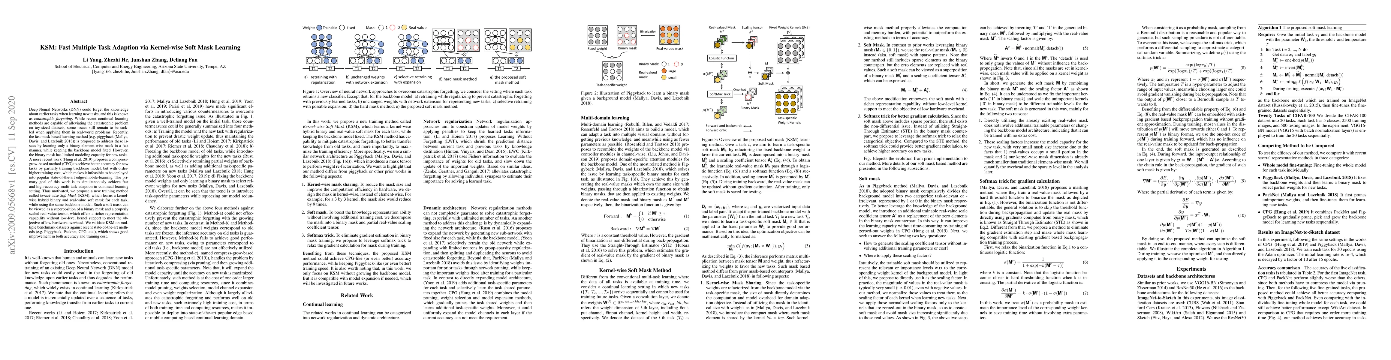 Deep Neural Networks (DNN) could forget the knowledge about earlier tasks when learning new tasks, and this is known as \textit{catastrophic forgetting}. While recent continual learning methods are capable of alleviating the catastrophic problem on toy-sized datasets, some issues still remain to be tackled when applying them in real-world problems. Recently, the fast mask-based learning method (e.g. piggyback \cite{mallya2018piggyback}) is proposed to address these issues by learning only a binary element-wise mask in a fast manner, while keeping the backbone model fixed. However, the binary mask has limited modeling capacity for new tasks. A more recent work \cite{hung2019compacting} proposes a compress-grow-based method (CPG) to achieve better accuracy for new tasks by partially training backbone model, but with order-higher training cost, which makes it infeasible to be deployed into popular state-of-the-art edge-/mobile-learning. The primary goal of this work is to simultaneously achieve fast and high-accuracy multi task adaption in continual learning setting. Thus motivated, we propose a new training method called \textit{kernel-wise Soft Mask} (KSM), which learns a kernel-wise hybrid binary and real-value soft mask for each task, while using the same backbone model. Such a soft mask can be viewed as a superposition of a binary mask and a properly scaled real-value tensor, which offers a richer representation capability without low-level kernel support to meet the objective of low hardware overhead. We validate KSM on multiple benchmark datasets against recent state-of-the-art methods (e.g. Piggyback, Packnet, CPG, etc.), which shows good improvement in both accuracy and training cost.
