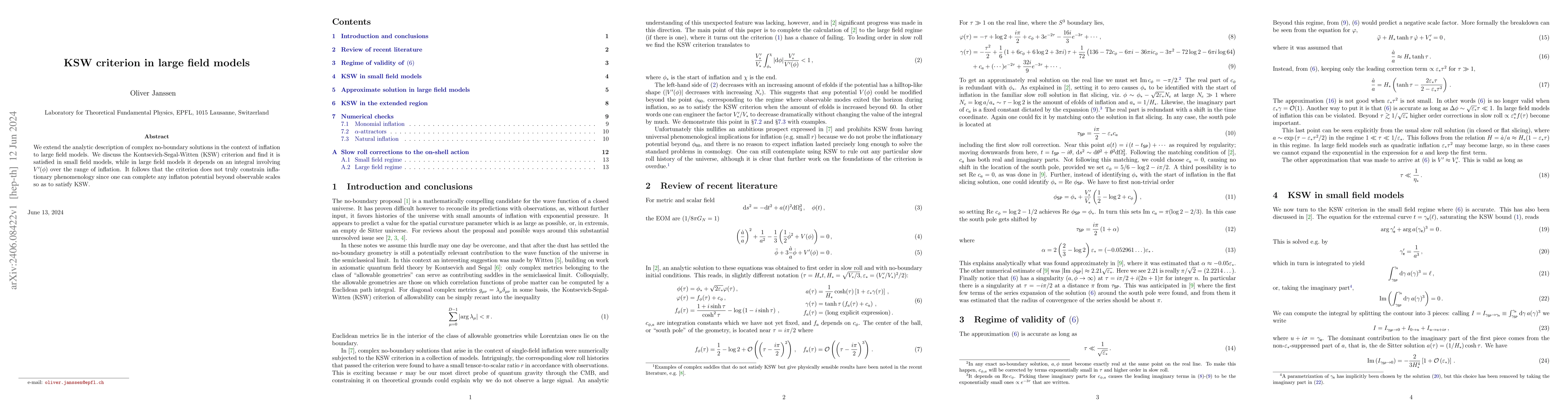 We extend the analytic description of complex no-boundary solutions in the context of inflation to large field models. We discuss the Kontsevich-Segal-Witten (KSW) criterion and find it is satisfied in small field models, while in large field models it depends on an integral involving $V'(\phi)$ over the range of inflation. It follows that the criterion does not truly constrain inflationary phenomenology since one can complete any inflaton potential beyond observable scales so as to satisfy KSW.