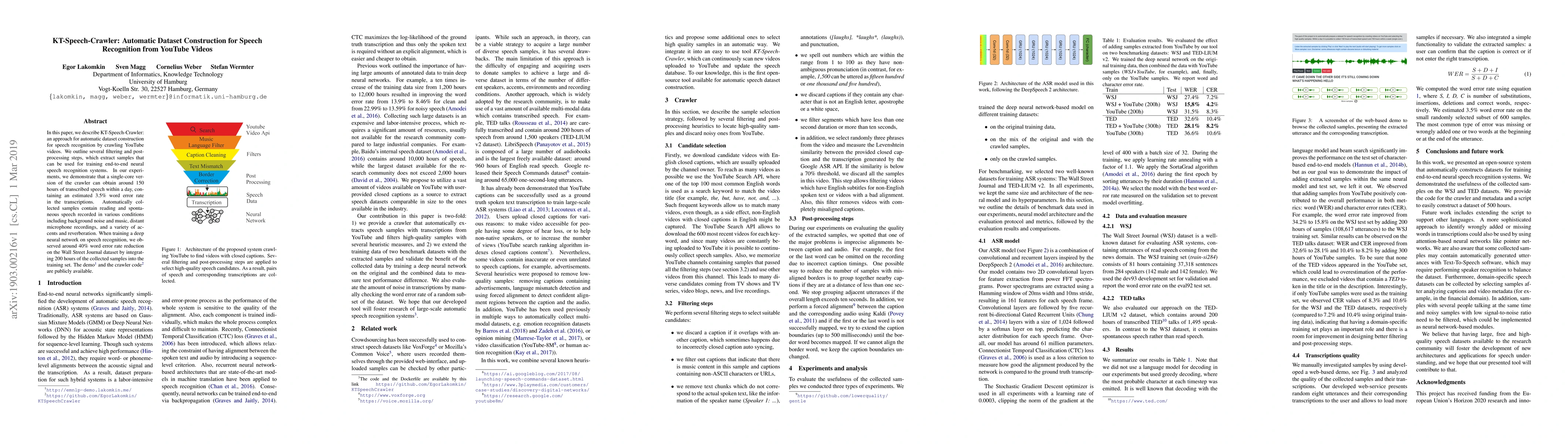 In this paper, we describe KT-Speech-Crawler: an approach for automatic dataset construction for speech recognition by crawling YouTube videos. We outline several filtering and post-processing steps, which extract samples that can be used for training end-to-end neural speech recognition systems. In our experiments, we demonstrate that a single-core version of the crawler can obtain around 150 hours of transcribed speech within a day, containing an estimated 3.5% word error rate in the transcriptions. Automatically collected samples contain reading and spontaneous speech recorded in various conditions including background noise and music, distant microphone recordings, and a variety of accents and reverberation. When training a deep neural network on speech recognition, we observed around 40\% word error rate reduction on the Wall Street Journal dataset by integrating 200 hours of the collected samples into the training set. The demo (http://emnlp-demo.lakomkin.me/) and the crawler code (https://github.com/EgorLakomkin/KTSpeechCrawler) are publicly available.