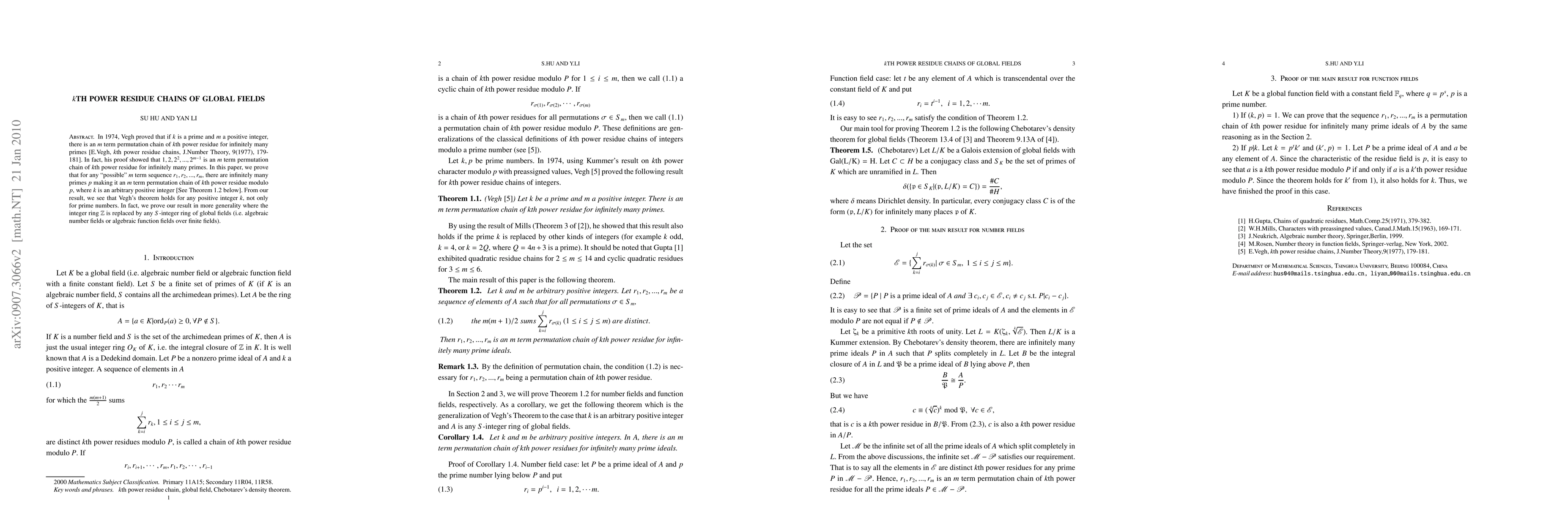 This paper extends Vegh's 1974 theorem on $k$th power residue chains to any positive integer $k$ and generalizes it to $S$-integer rings of global fields. It proves that any given $m$ term sequence can be a permutation chain of $k$th power residues for infinitely many primes.