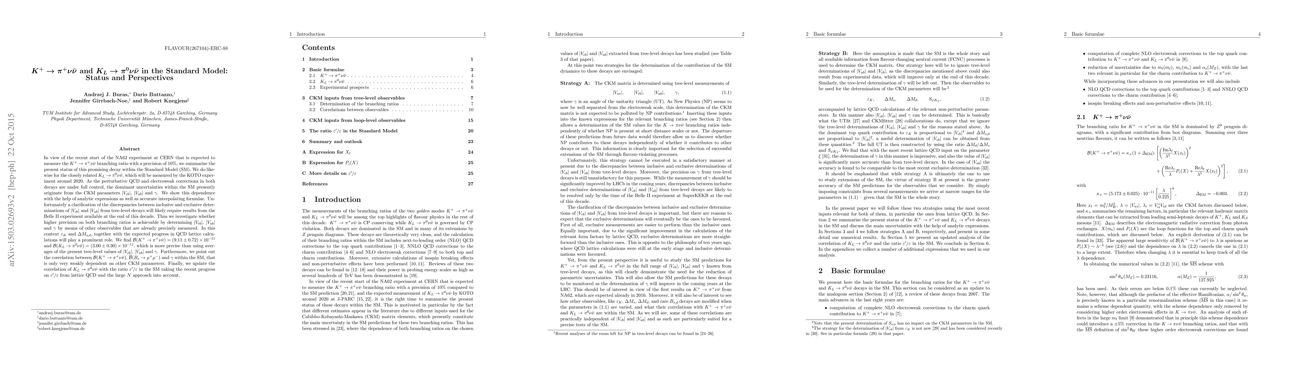 This paper summarizes the current status and perspectives of the rare decays $K^+\to\pi^+\nu\bar\nu$ and $K_L\to\pi^0\nu\bar\nu$ within the Standard Model, highlighting the uncertainties due to CKM parameters. It finds more precise branching ratios using alternative observables and discusses the correlation between these decays and other Standard Model quantities.