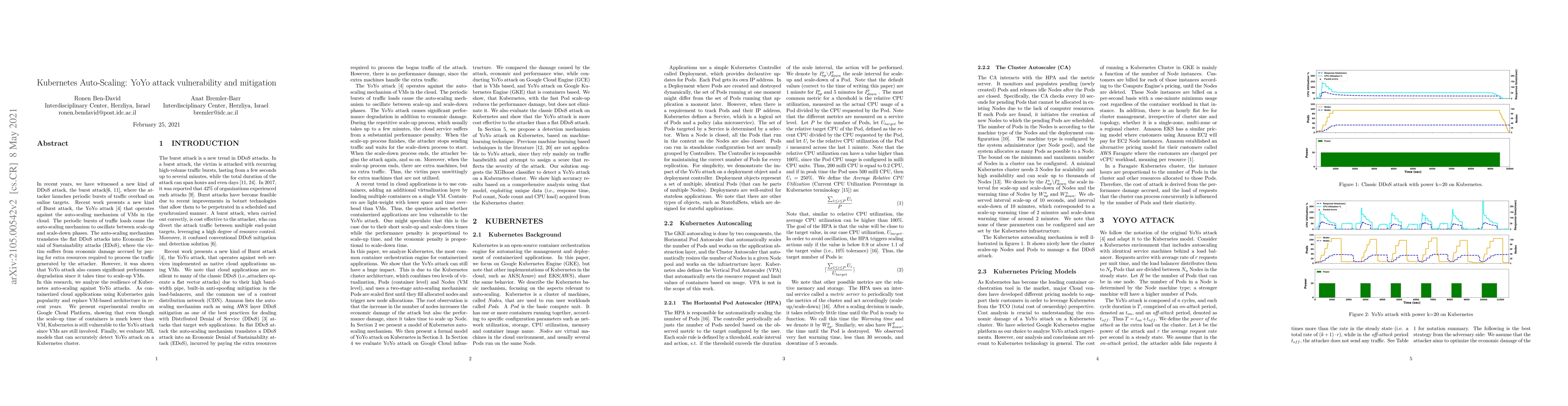 This paper investigates the vulnerability of Kubernetes auto-scaling to the YoYo attack, a type of DDoS attack that exploits the auto-scaling mechanism by causing periodic traffic bursts. Despite the faster scale-up time of containers compared to VMs, Kubernetes remains susceptible to performance degradation and economic damage from YoYo attacks. The study also evaluates machine learning models for detecting such attacks in Kubernetes environments.
