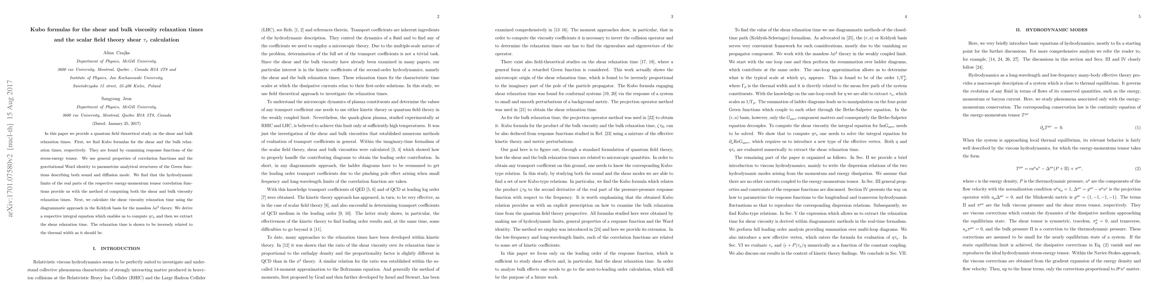 This paper derives Kubo formulae for shear and bulk relaxation times using quantum field theory and the stress-energy tensor's response functions. It computes the shear viscosity relaxation time in the $\lambda\phi^4$ theory, demonstrating an inverse relationship with the thermal width.