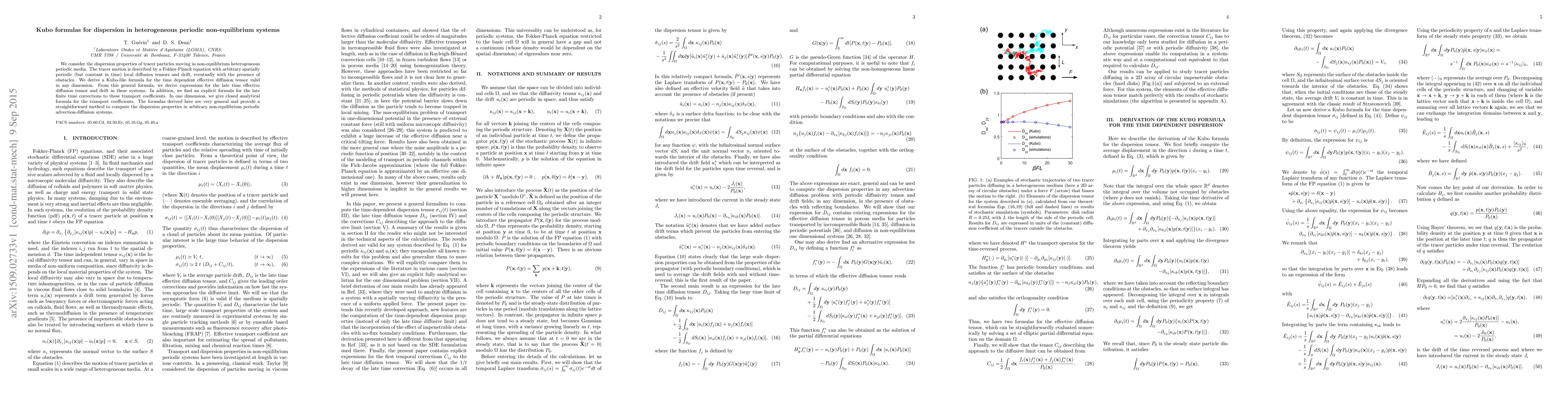 This paper derives a Kubo-like formula for the effective diffusion tensor in non-equilibrium heterogeneous periodic systems, providing expressions for late-time transport coefficients and corrections. The results are general and applicable to compute dispersion properties in various non-equilibrium advection-diffusion systems.