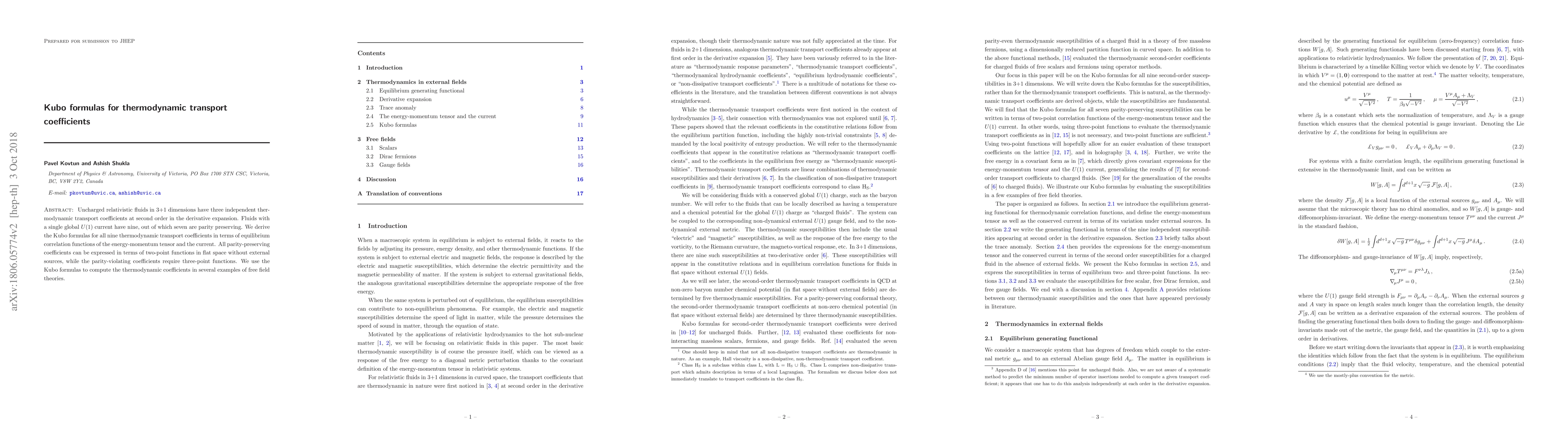 This paper derives Kubo formulas for the nine thermodynamic transport coefficients of relativistic fluids with a single global $U(1)$ current, relating them to equilibrium correlation functions. It shows that parity-preserving coefficients can be expressed using two-point functions, while parity-violating ones require three-point functions, and applies these formulas to compute coefficients in free field theories.